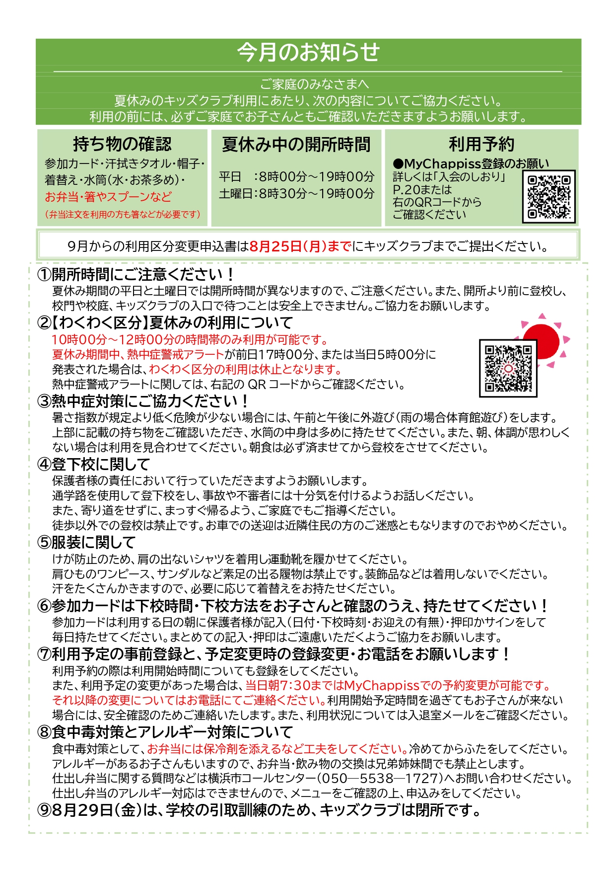 ※交通機関が不通となる場合もありますので、できるだけ早いお迎えをお願いします。※特別警報発表時は帰宅の安全が確保されるまで、お子さんは利用区分にかかわらず、放課後キッズクラブで留め置きとなります。