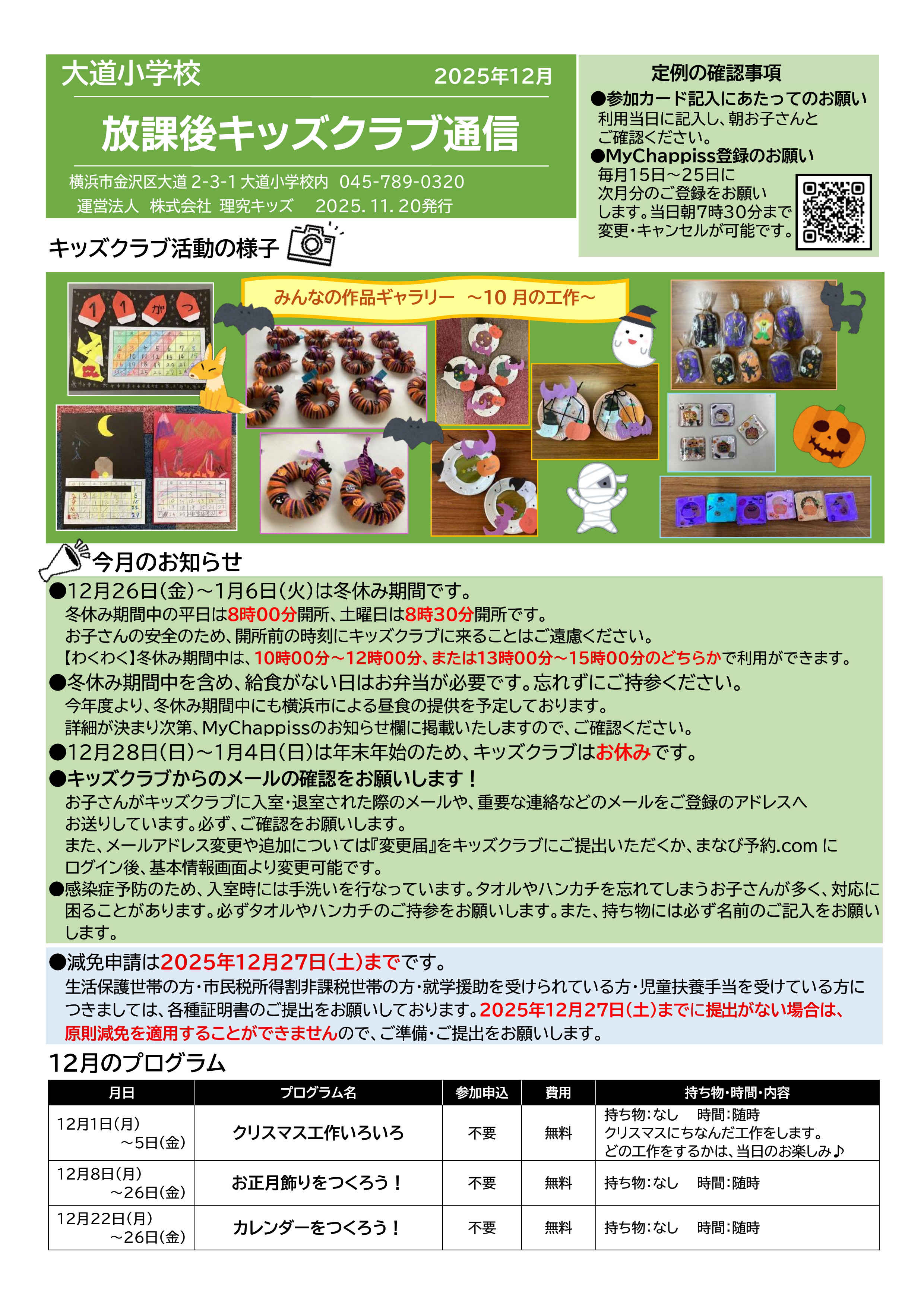 ※交通機関が不通となる場合もありますので、できるだけ早いお迎えをお願いします。※特別警報発表時は帰宅の安全が確保されるまで、お子さんは利用区分にかかわらず、放課後キッズクラブで留め置きとなります。