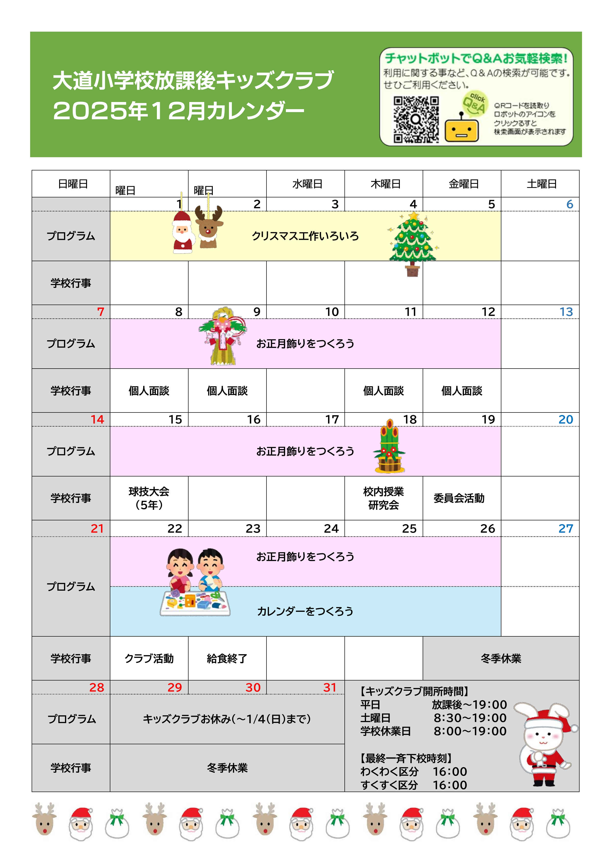 「暴風警報」・「大雪警報」・「暴風雪警報」・「降灰予報」発表中は、帰宅時刻に関わらず、利用しているすべてのお子さんの保護者か代理の方のお迎えが必要です。子どもたちはお迎えが来るまで放課後キッズクラブで待機します。