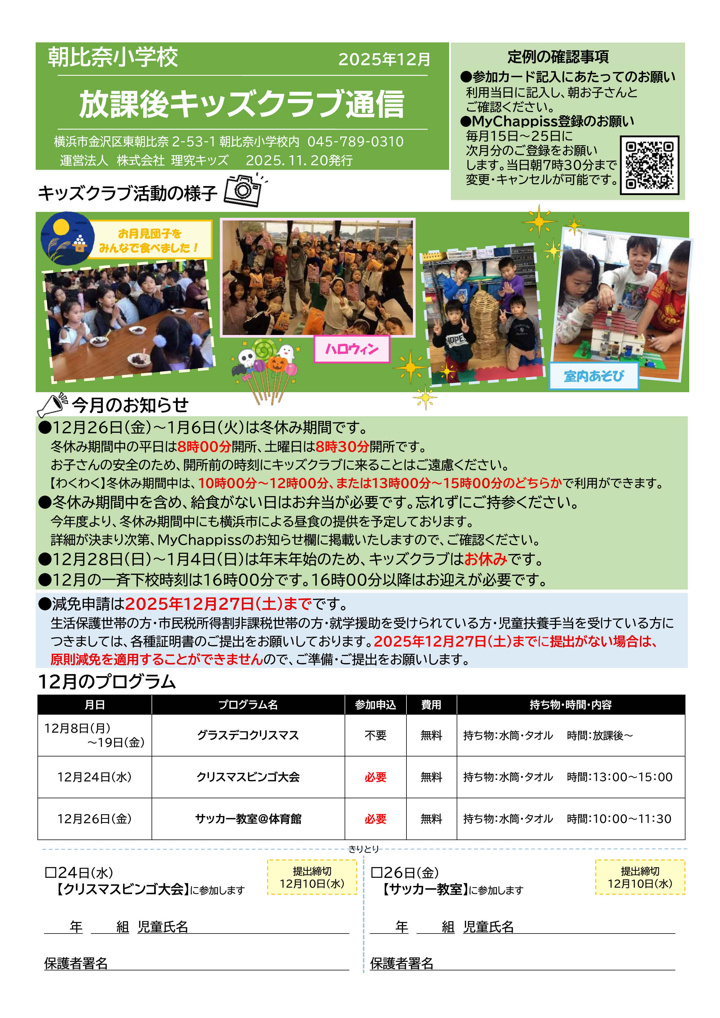 - 参加カード(利用日に「帰宅時間」「お迎えの有無」「保護者印(署名も可)」の記入あり)