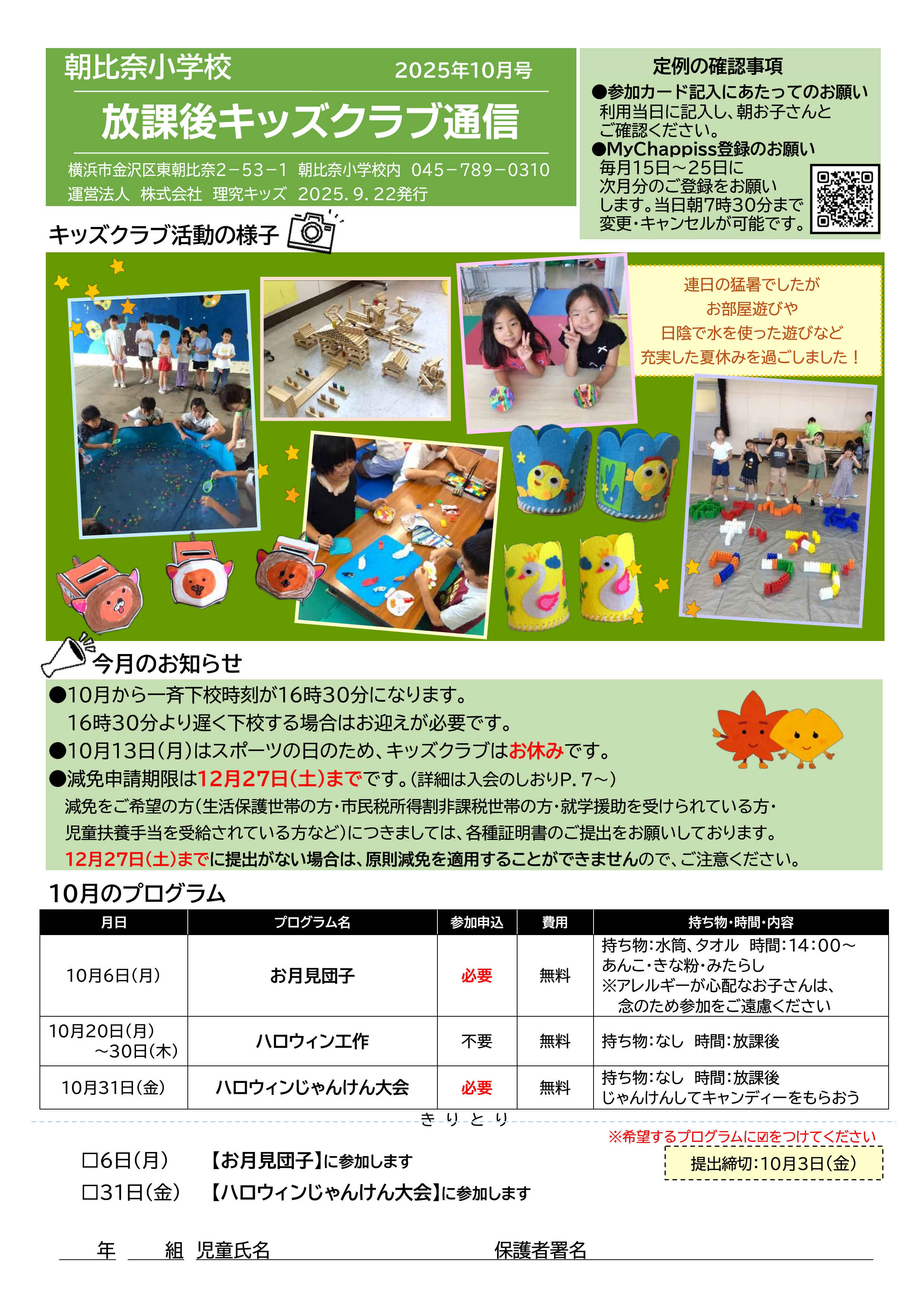 - 参加カード(利用日に「帰宅時間」「お迎えの有無」「保護者印(署名も可)」の記入あり)
