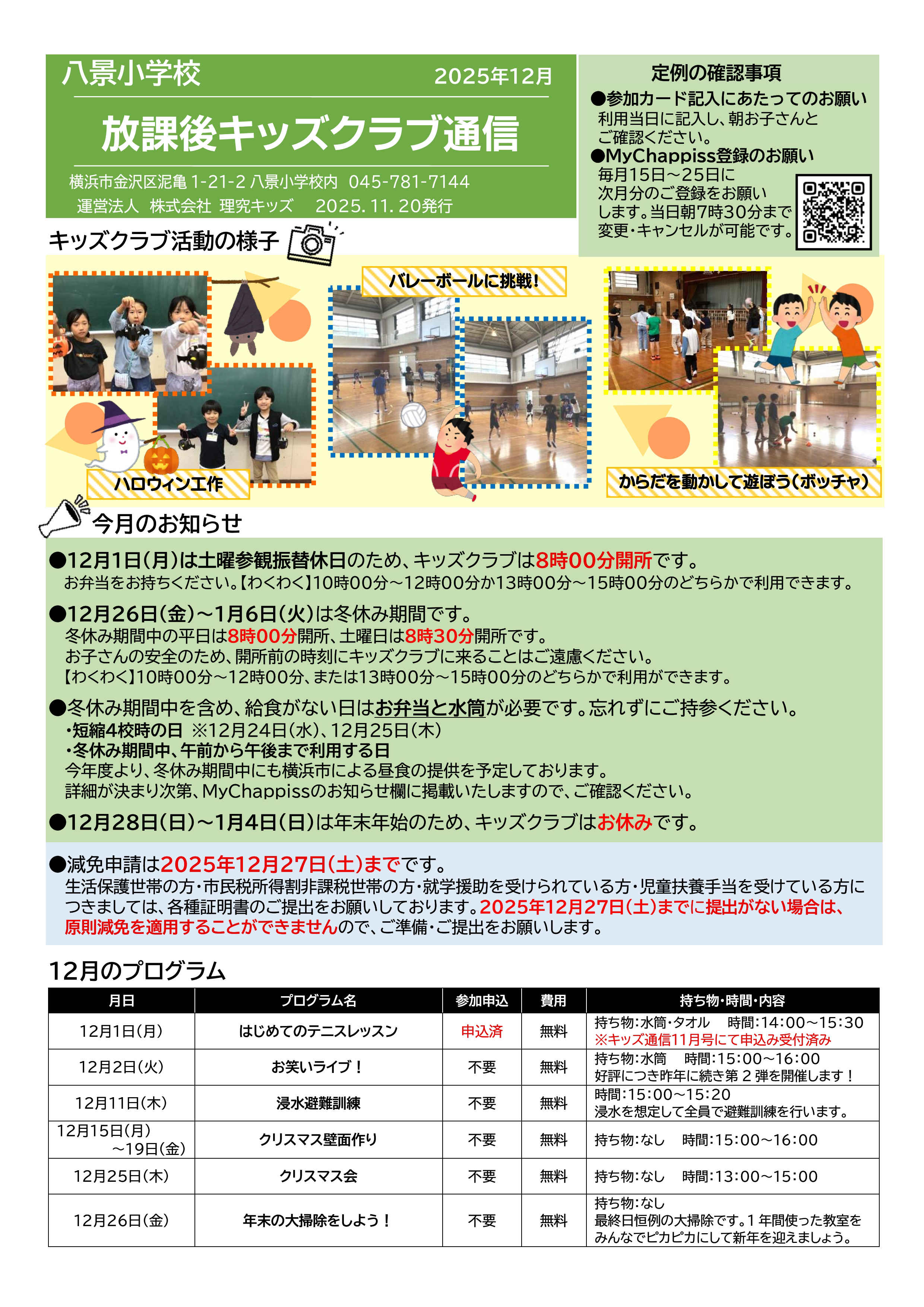 午前6時の段階で、横浜市内に「暴風警報」「大雪警報」「暴風雪警報」「降灰予報」が発表された場合、放課後キッズクラブは、開所せず閉所とします。