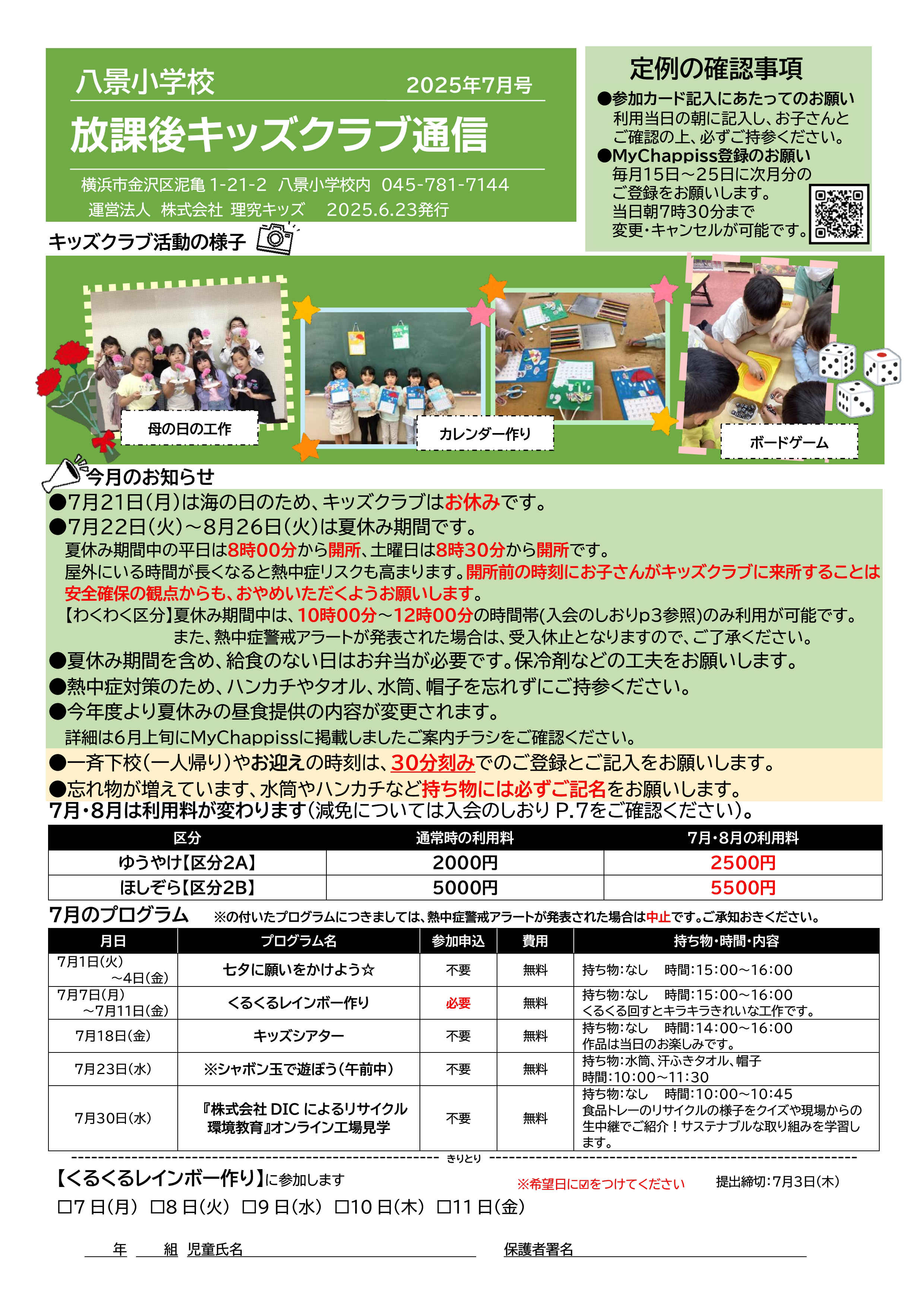 - 参加カード(利用日に「帰宅時間」「お迎えの有無」「保護者印(署名も可)」の記入あり)