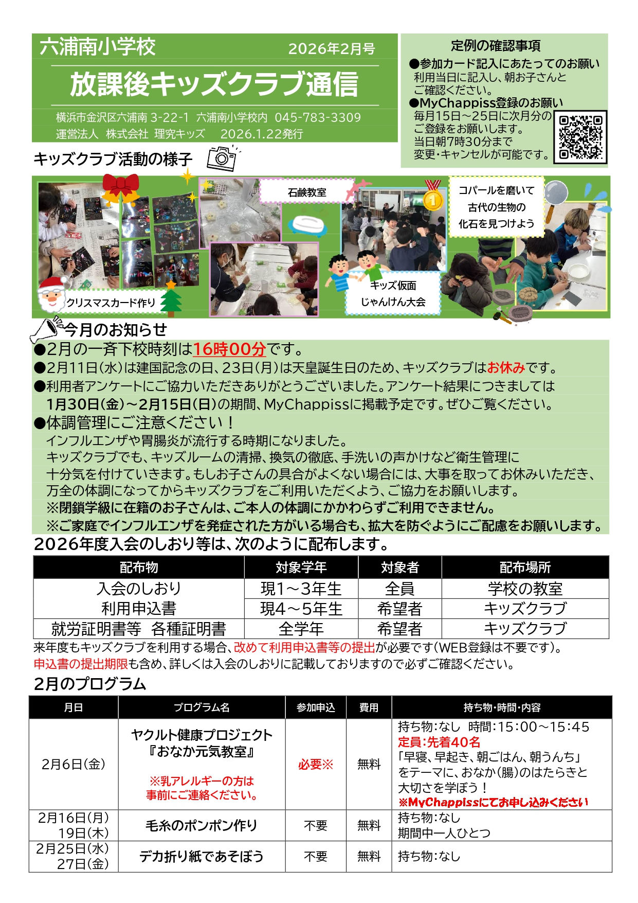 午前6時の段階で横浜市内に「暴風警報」「大雪警報」「暴風雪警報」「降灰予報」「土砂災害警報情報避難勧告」が発表された場合、放課後キッズクラブは開所せず、閉所とします。