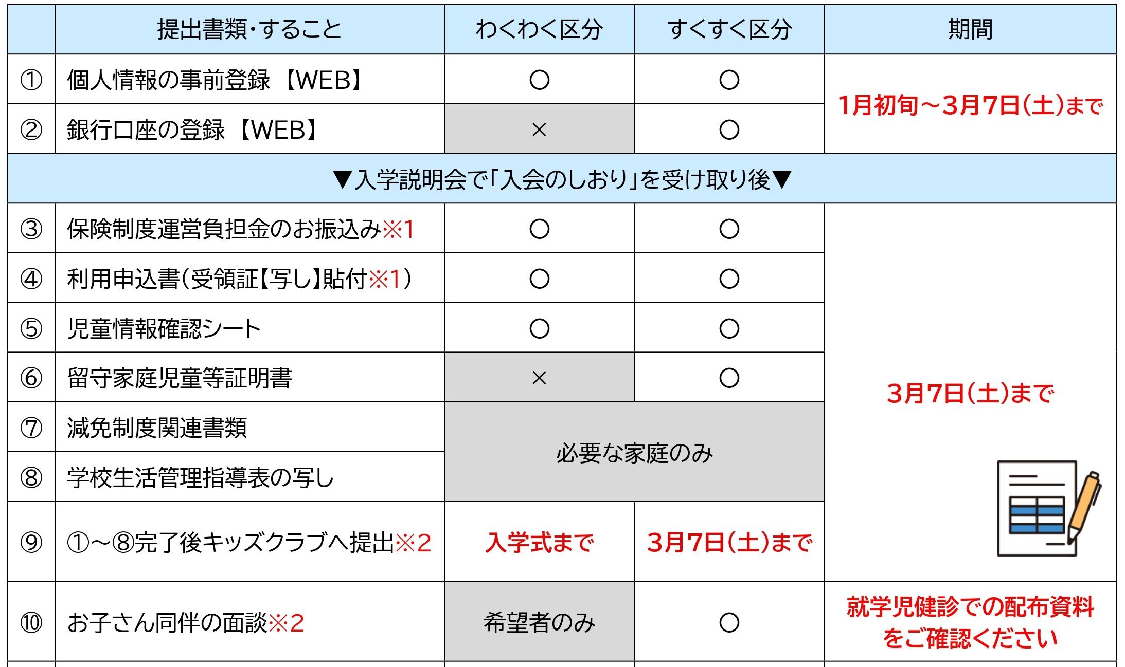 ※2…書類をご提出いただく前に、面談の予約含めキッズクラブまでお電話をいただけると大変スムーズです。