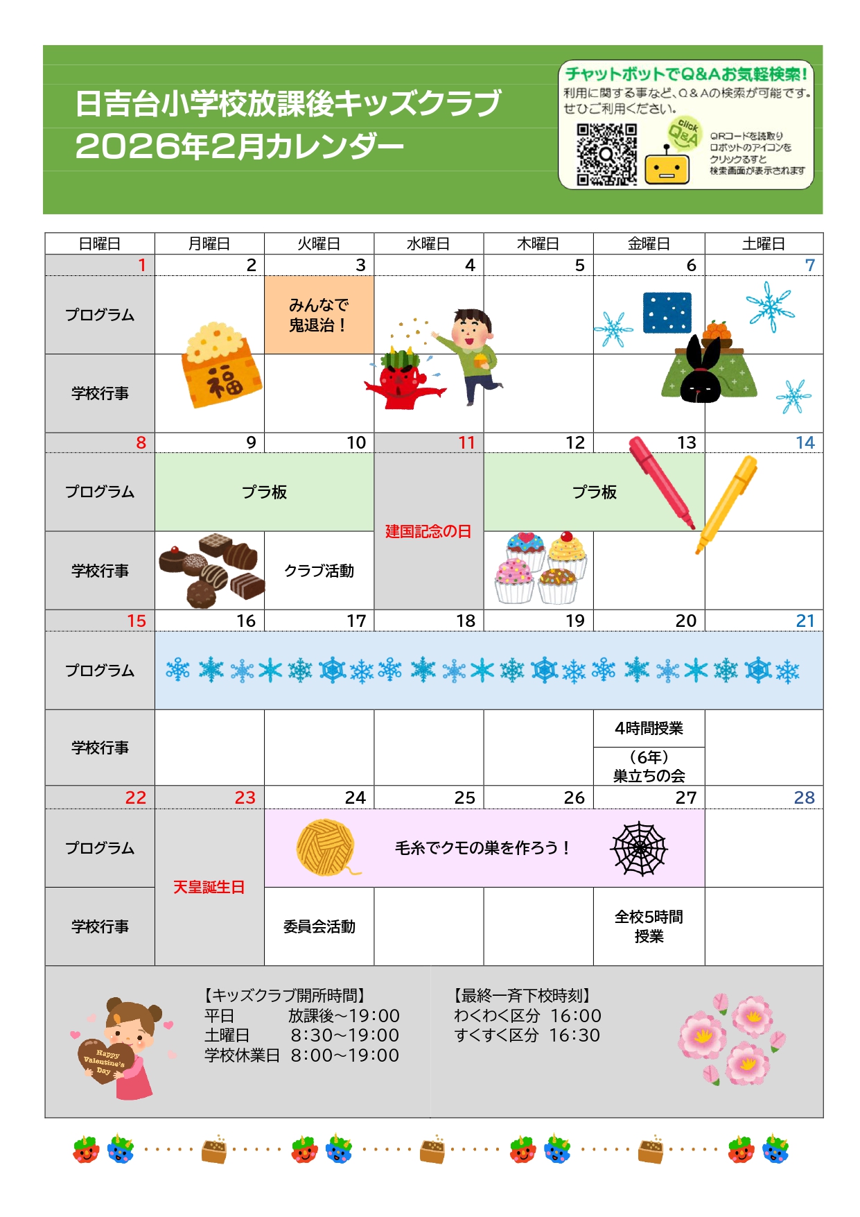 「暴風警報」・「大雪警報」・「暴風雪警報」・「降灰予報」発表中は、帰宅時刻に関わらず、利用しているすべてのお子さんの保護者か代理の方のお迎えが必要です。子どもたちはお迎えが来るまで放課後キッズクラブで待機します。