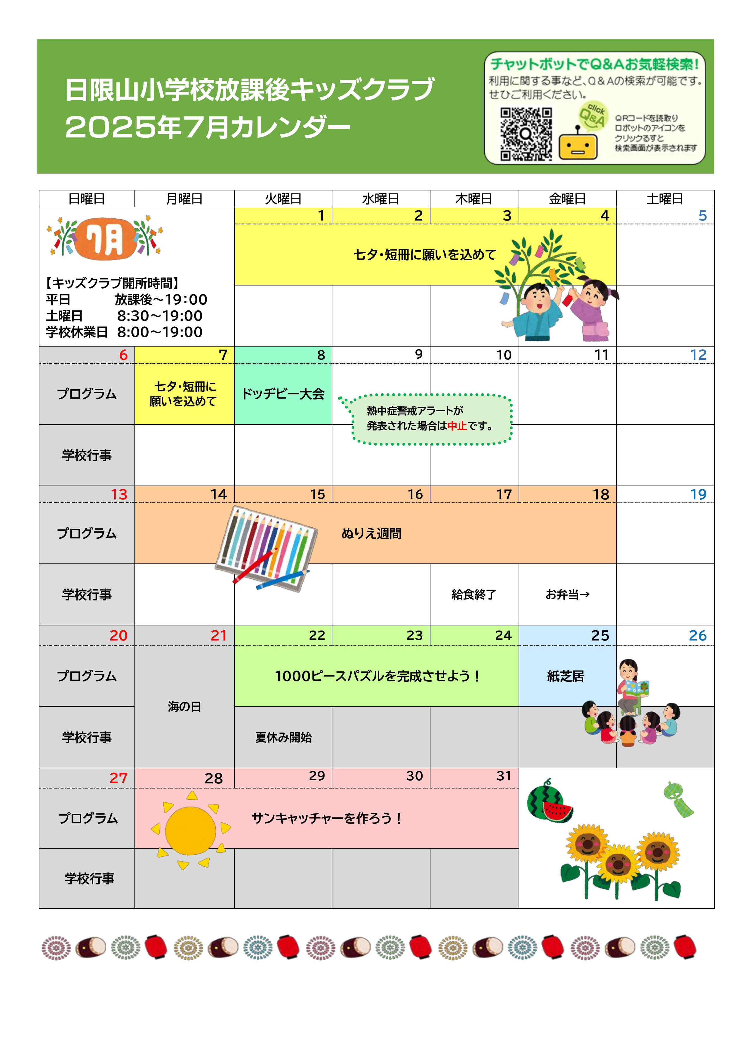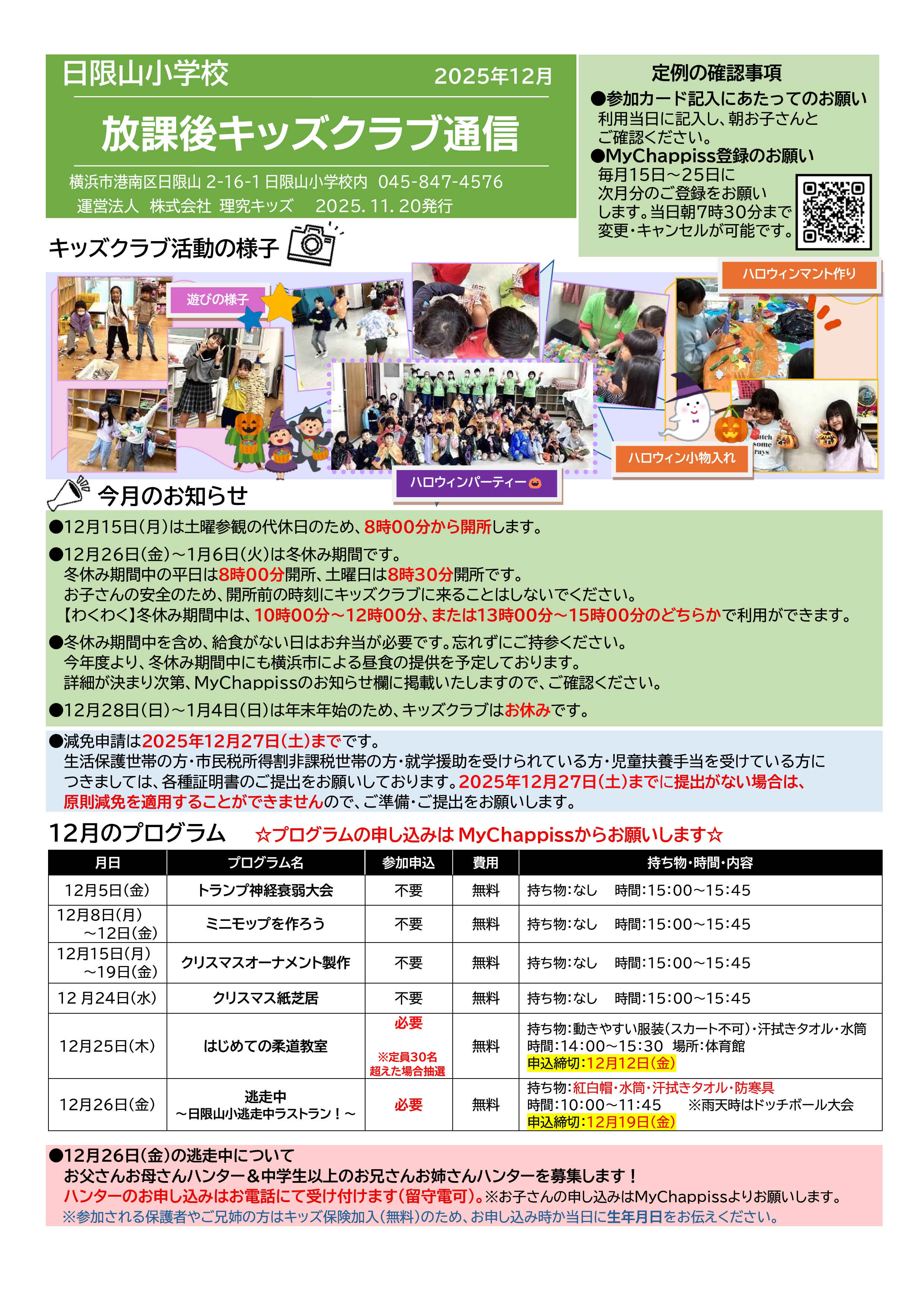 ※交通機関が不通となる場合もありますので、できるだけ早いお迎えをお願いします。※特別警報発表時は帰宅の安全が確保されるまで、お子さんは利用区分にかかわらず、放課後キッズクラブで留め置きとなります。