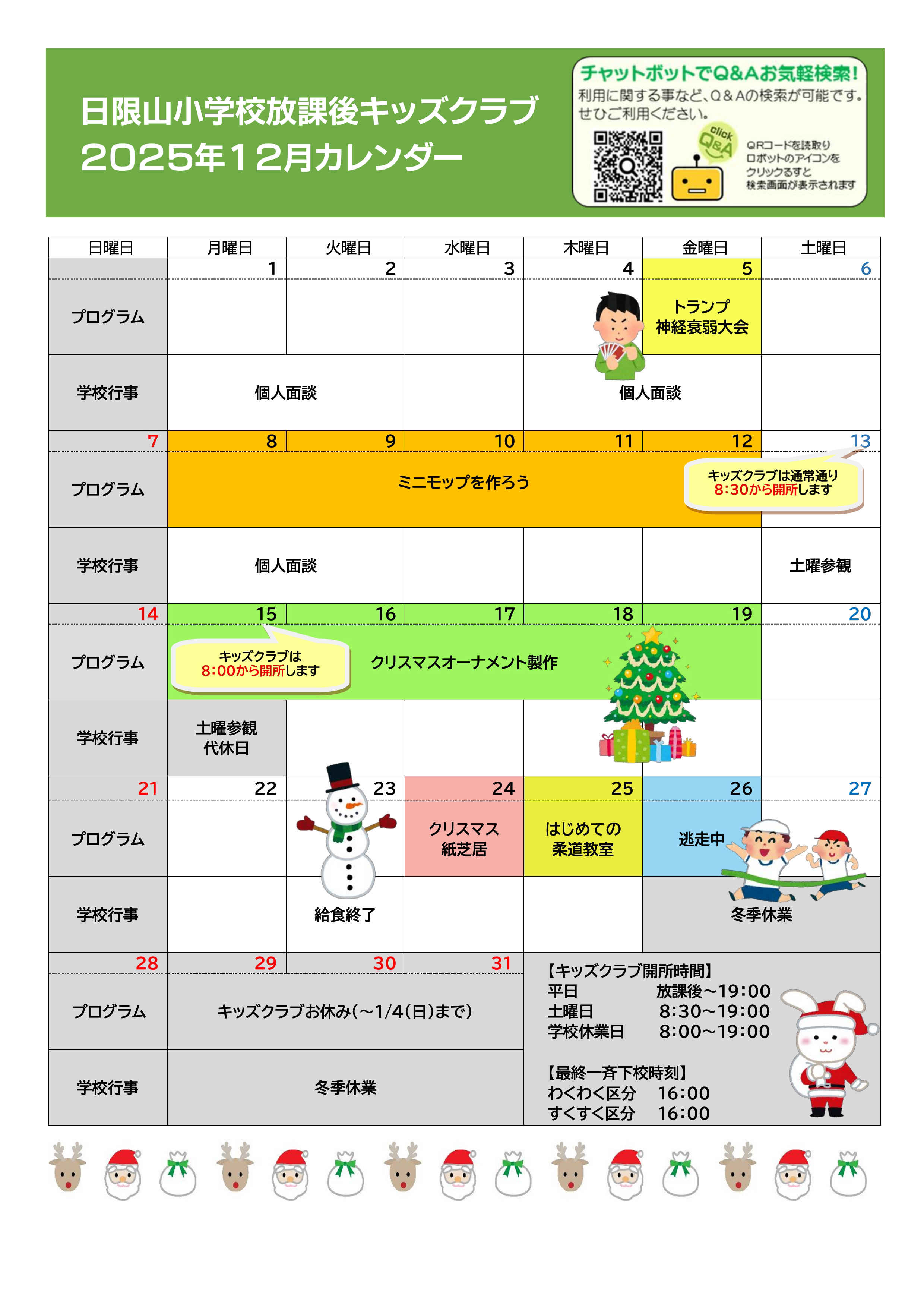 「暴風警報」・「大雪警報」・「暴風雪警報」・「降灰予報」発表中は、帰宅時刻に関わらず、利用しているすべてのお子さんの保護者か代理の方のお迎えが必要です。子どもたちはお迎えが来るまで放課後キッズクラブで待機します。