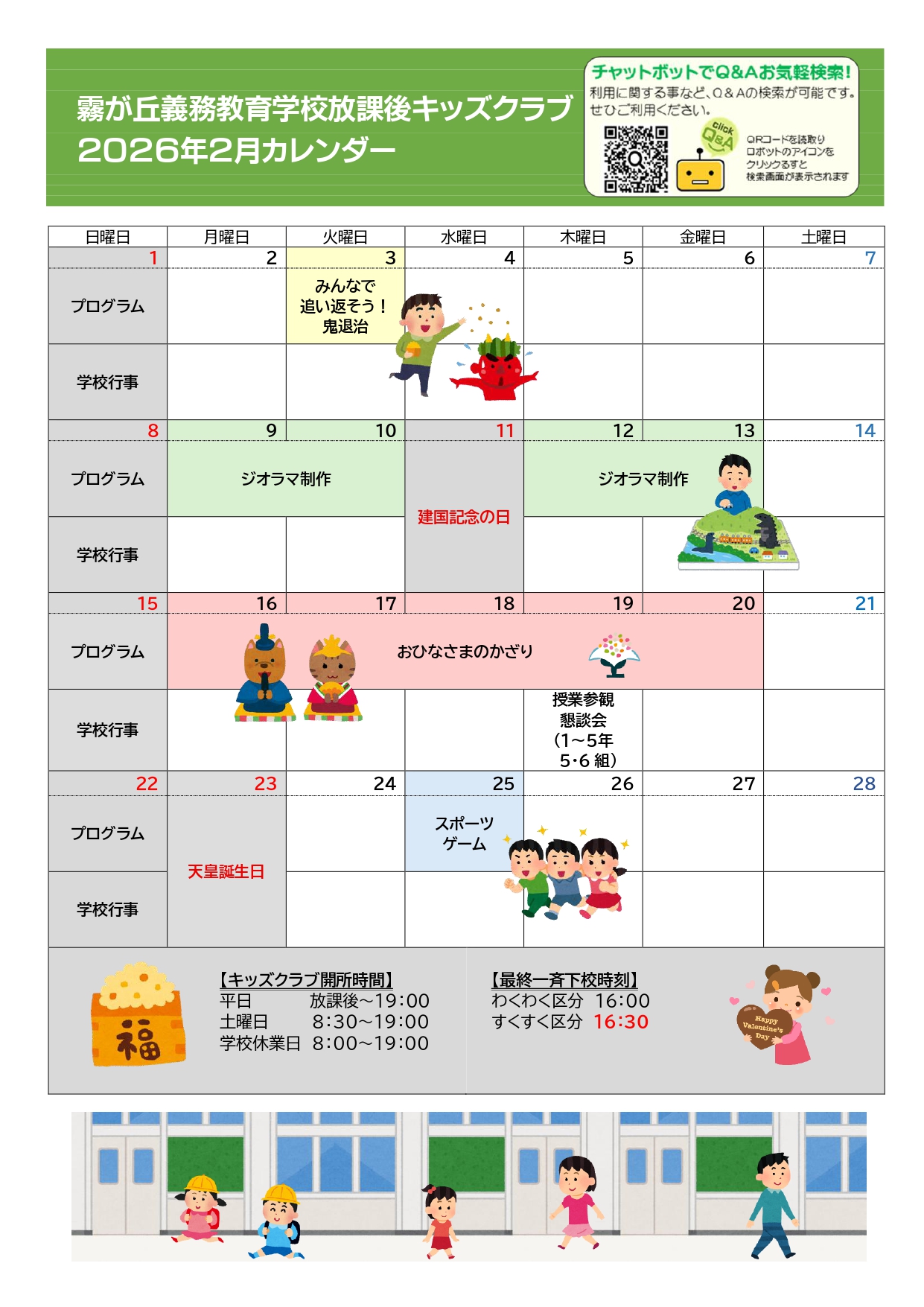 「暴風警報」・「大雪警報」・「暴風雪警報」・「降灰予報」発表中は、帰宅時刻に関わらず、利用しているすべてのお子さんの保護者か代理の方のお迎えが必要です。子どもたちはお迎えが来るまで放課後キッズクラブで待機します。