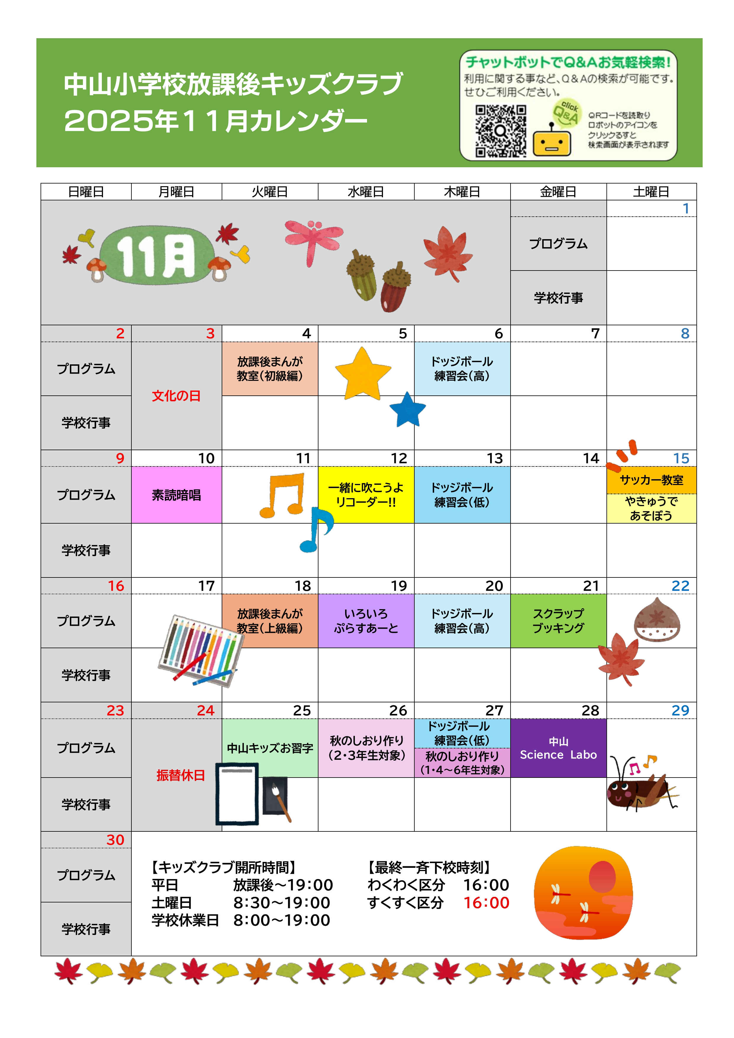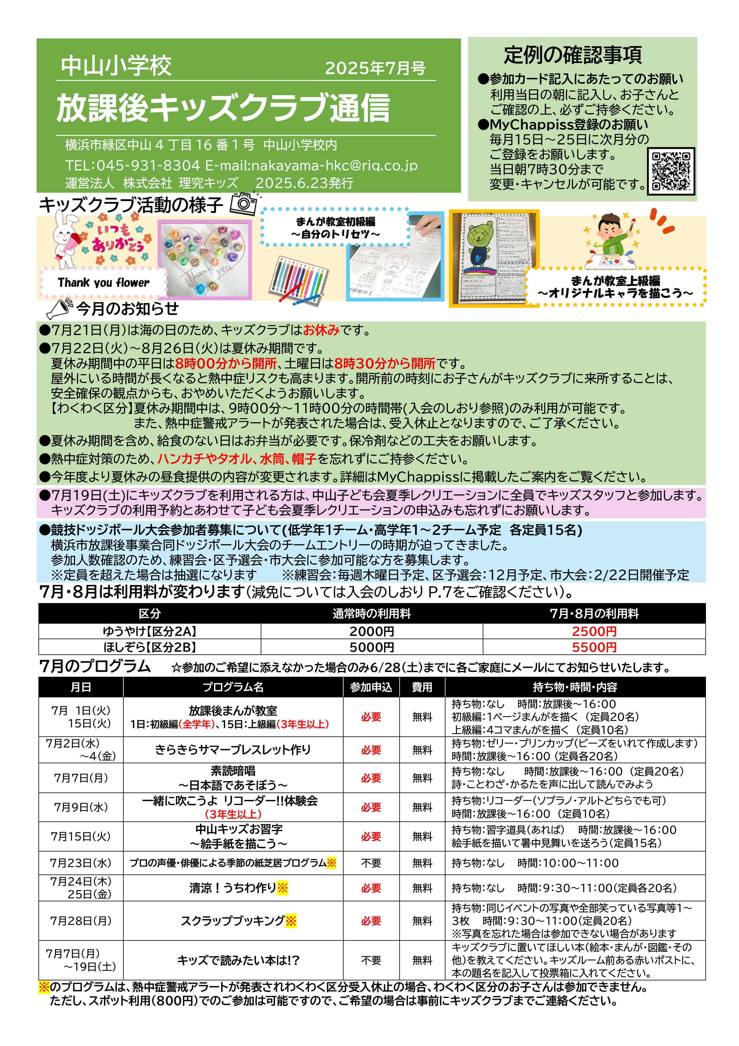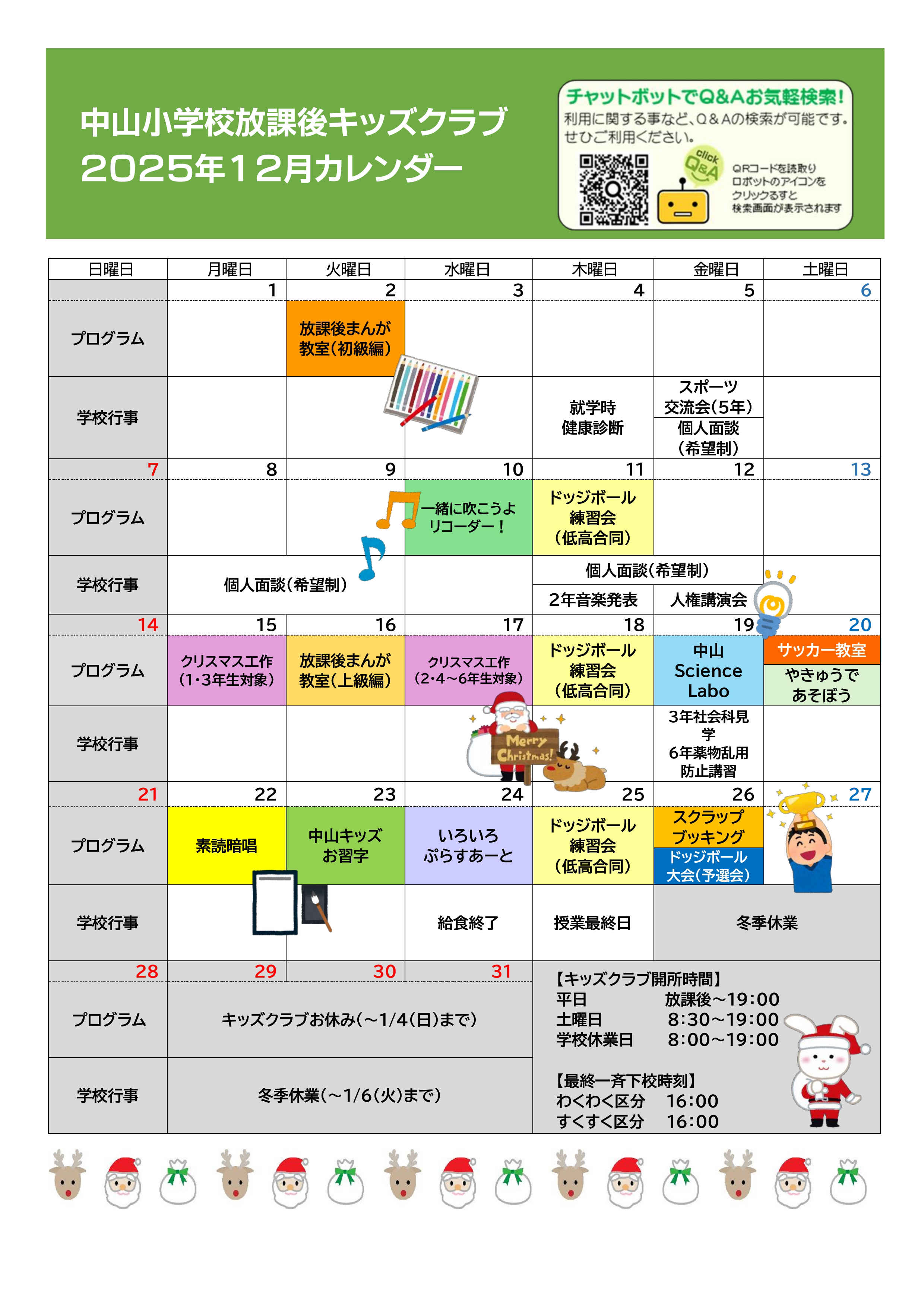 ※特別警報発表時または「避難情報」の発表や、学校が直接引き取りの対応をする場合はキッズクラブは閉所となります。
