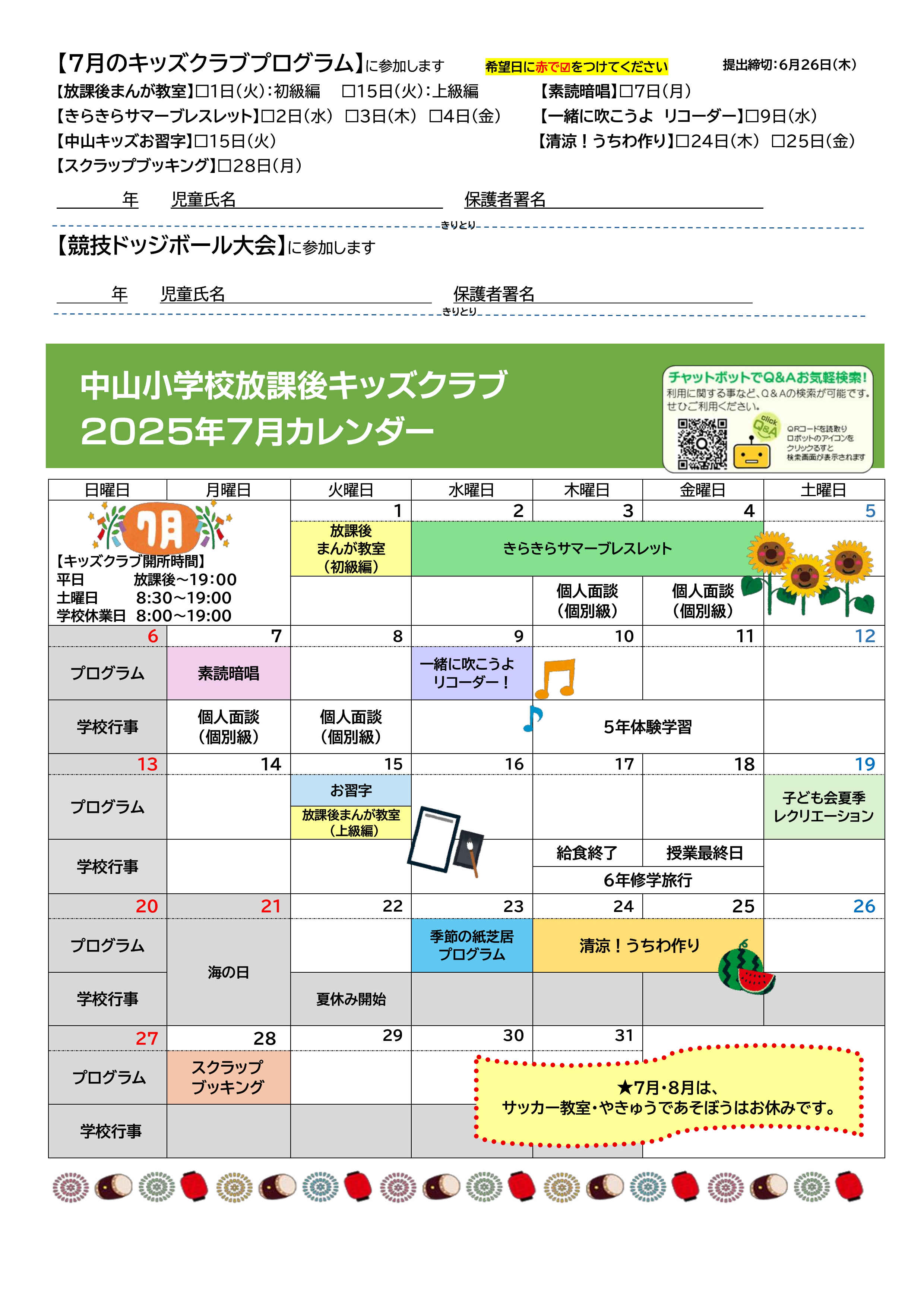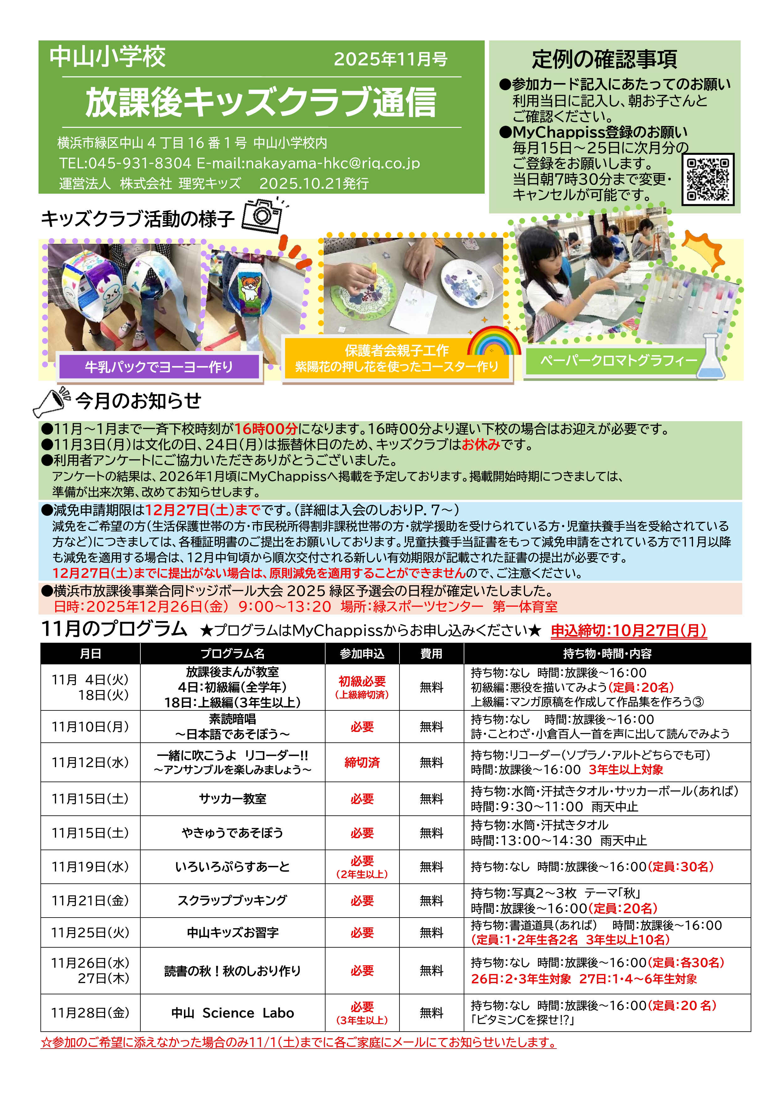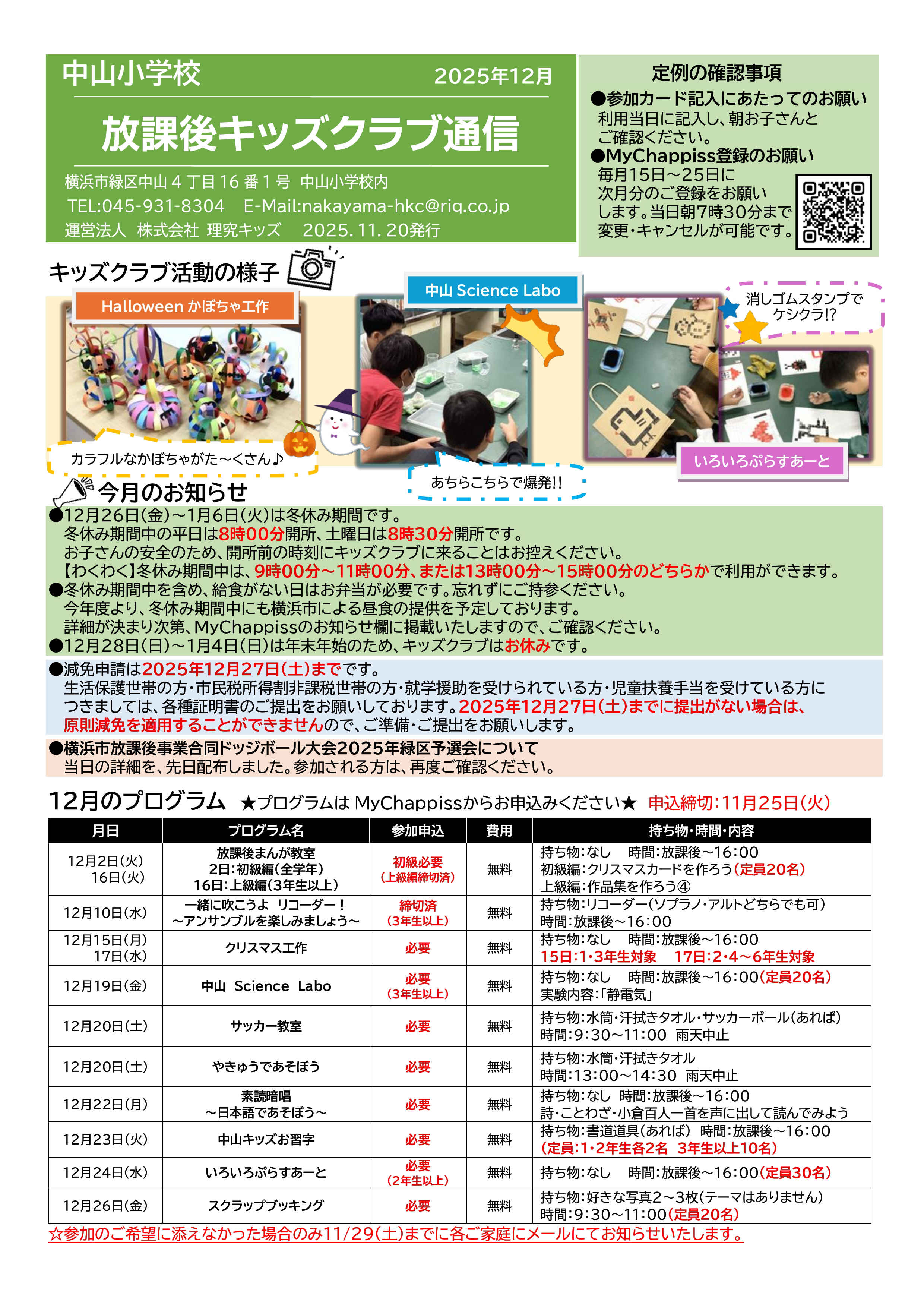 ※特別警報発表時または「避難情報」の発表や、学校が直接引き取りの対応をする場合はキッズクラブは閉所となります。