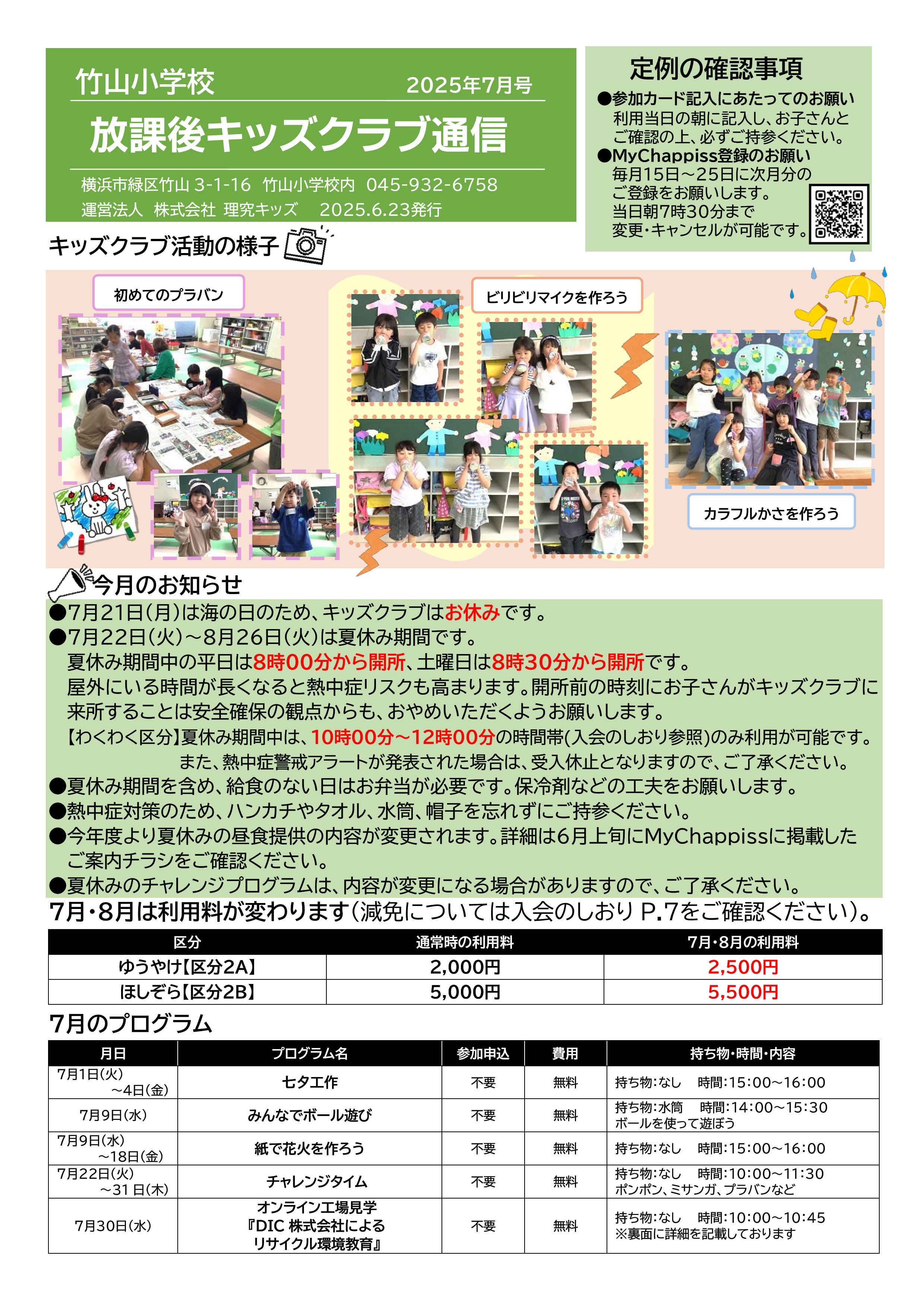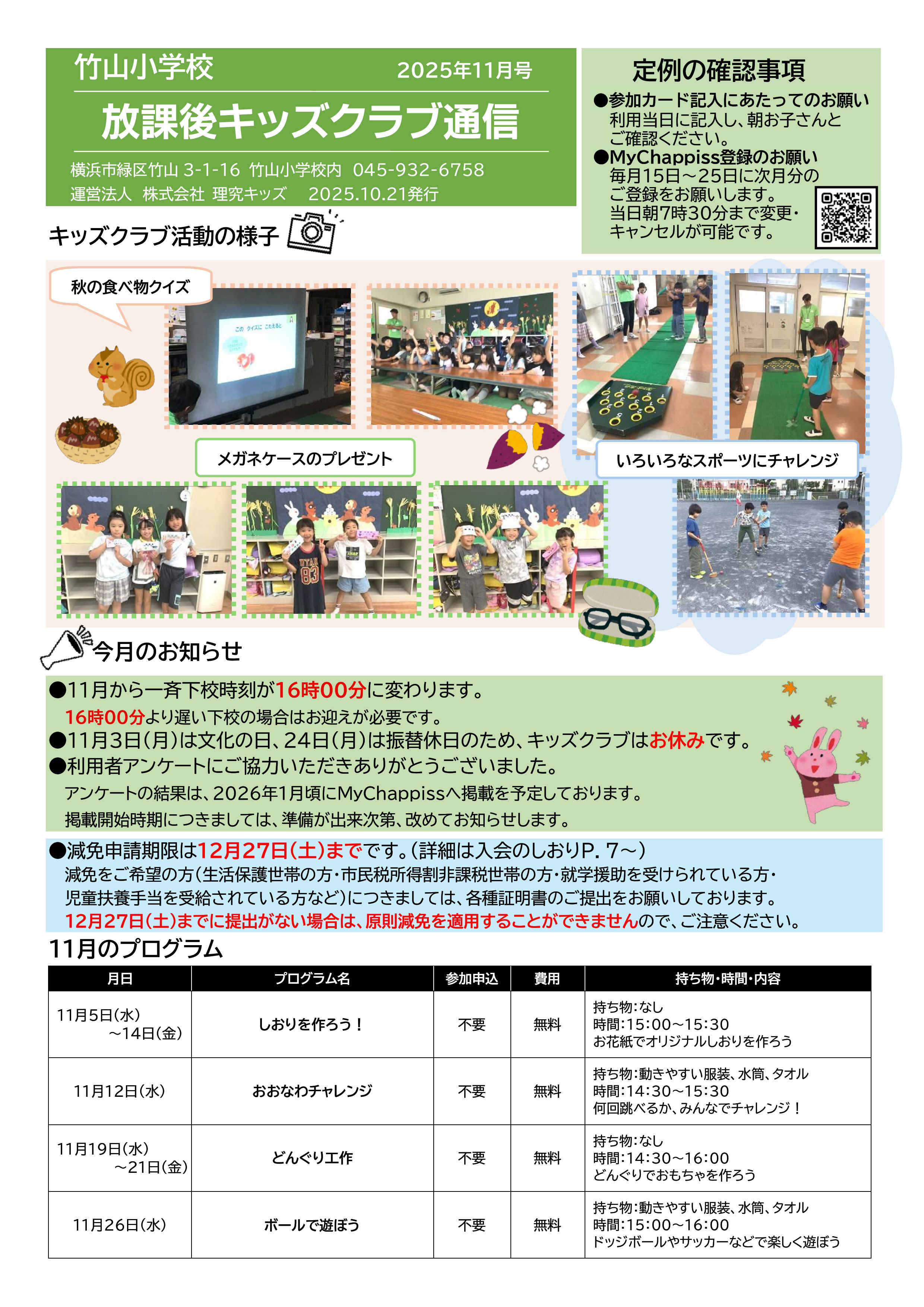 警報発表時等で通常と開所時間が異なる場合は、スタッフが放課後キッズクラブに到着してから利用可能になります。受け入れ可能になり次第、メールにてお知らせします。