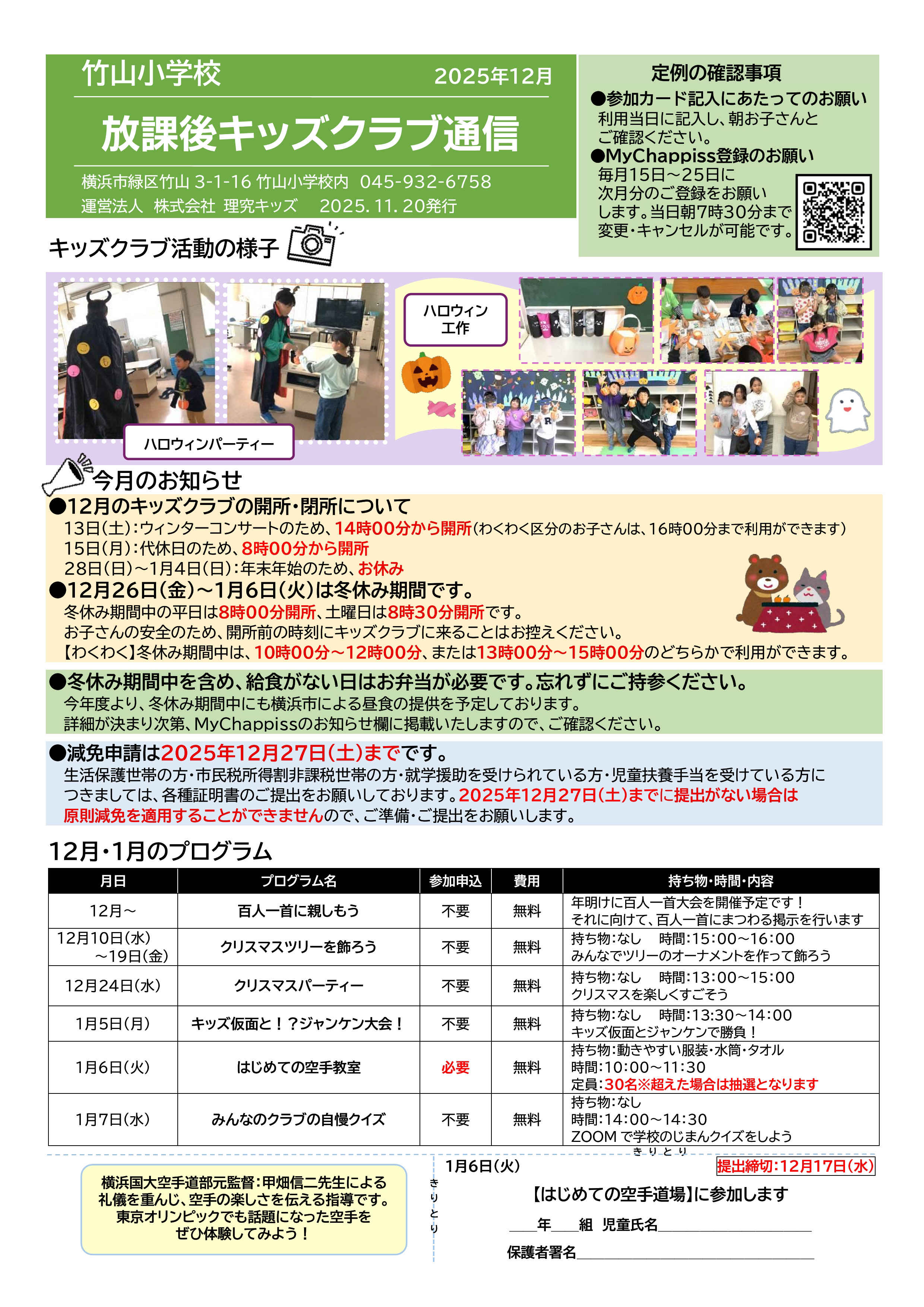 ※交通機関が不通となる場合もありますので、できるだけ早いお迎えをお願いします。※特別警報発表時は帰宅の安全が確保されるまで、お子さんは利用区分にかかわらず、放課後キッズクラブで留め置きとなります。