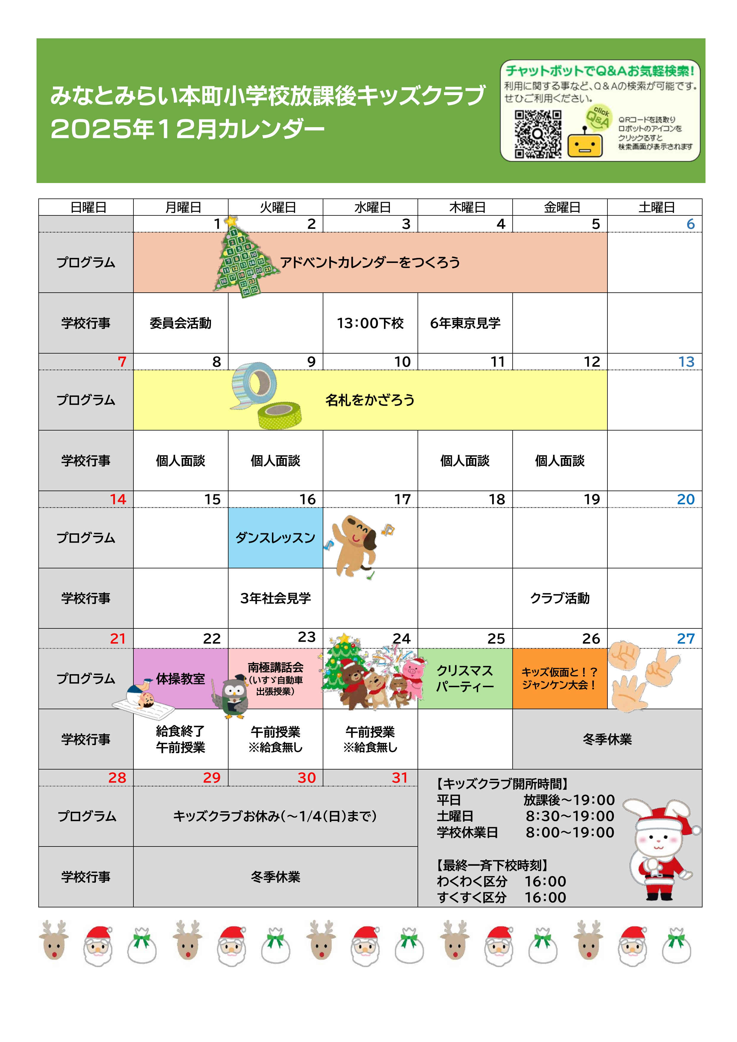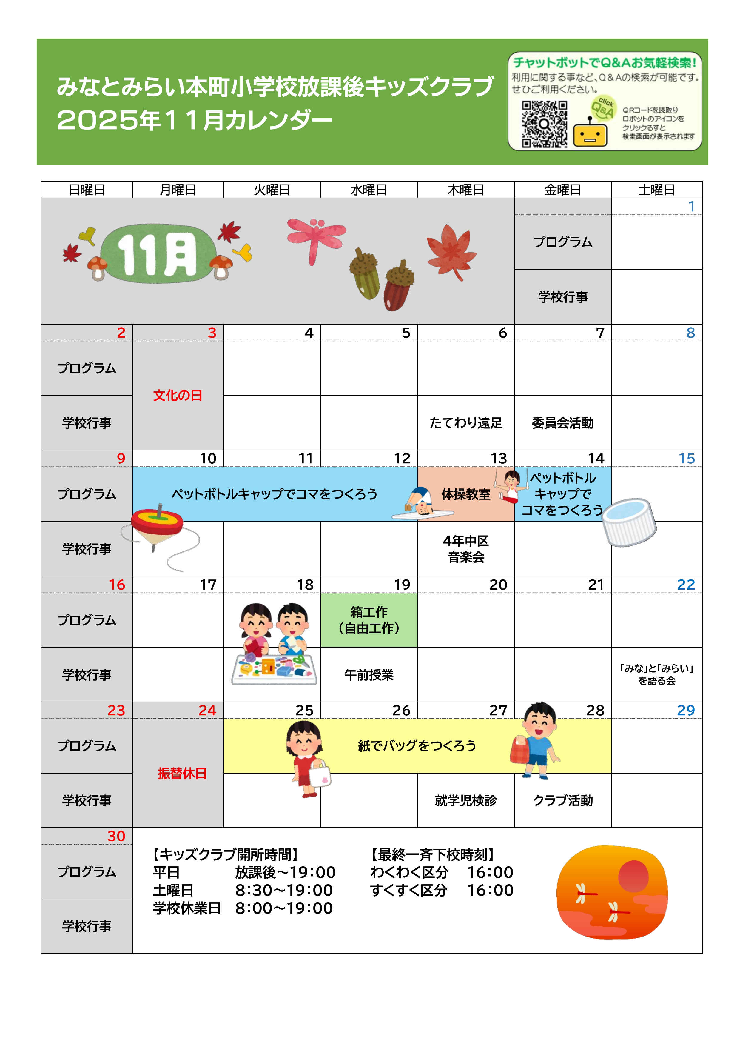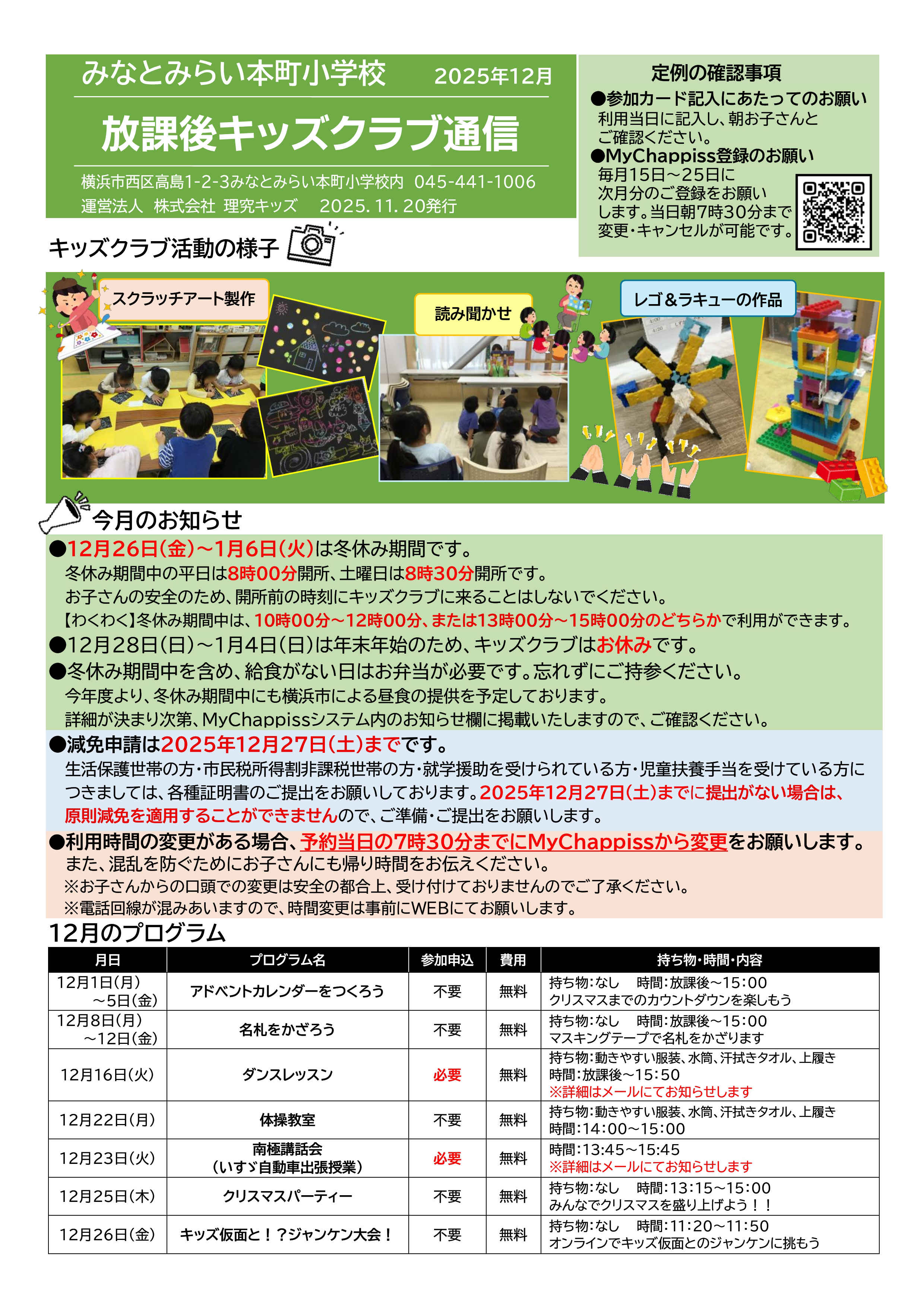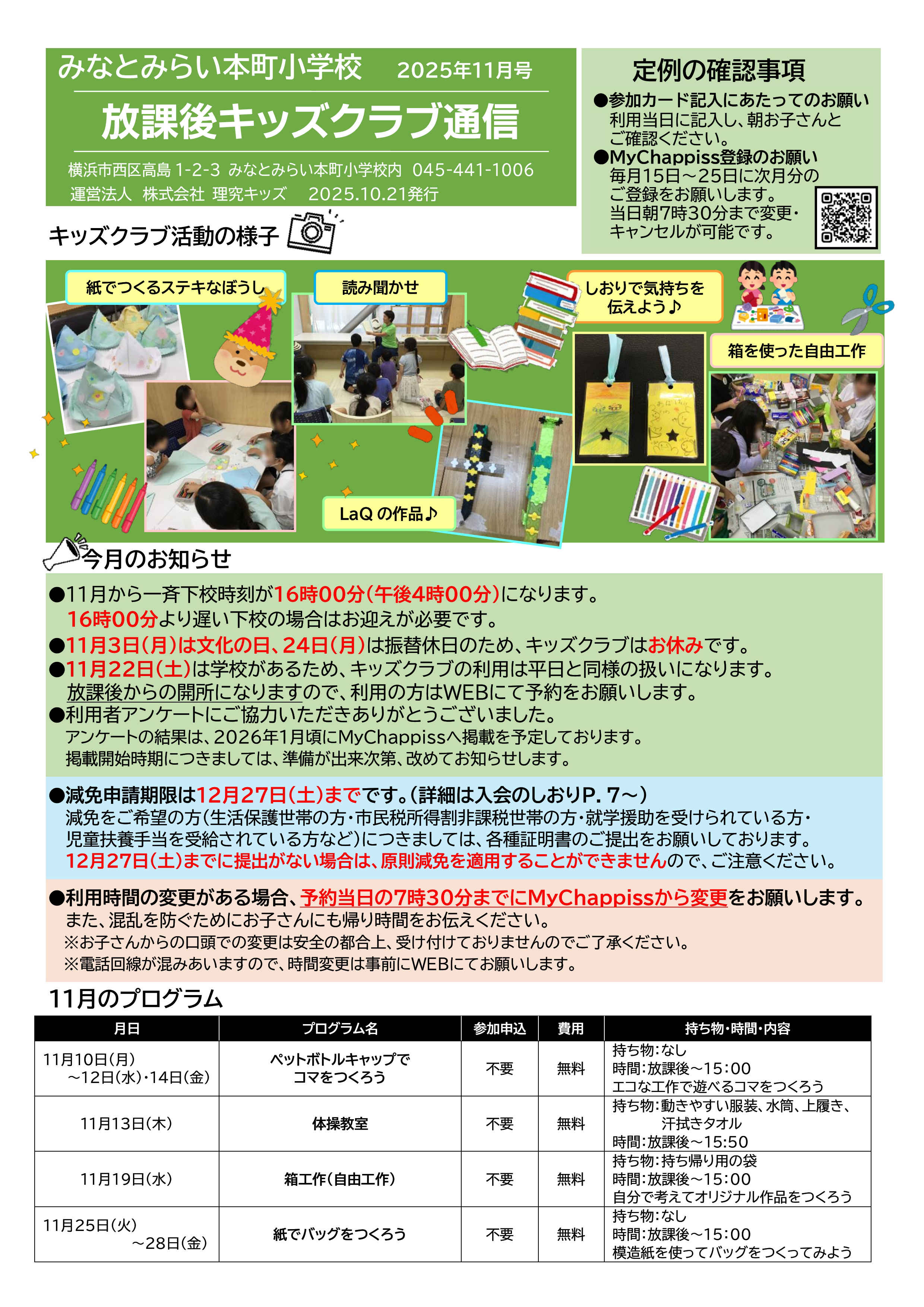 ※交通機関が不通となる場合もありますので、できるだけ早いお迎えをお願いします。※特別警報発表時は帰宅の安全が確保されるまで、お子さんは利用区分にかかわらず、放課後キッズクラブで留め置きとなります。