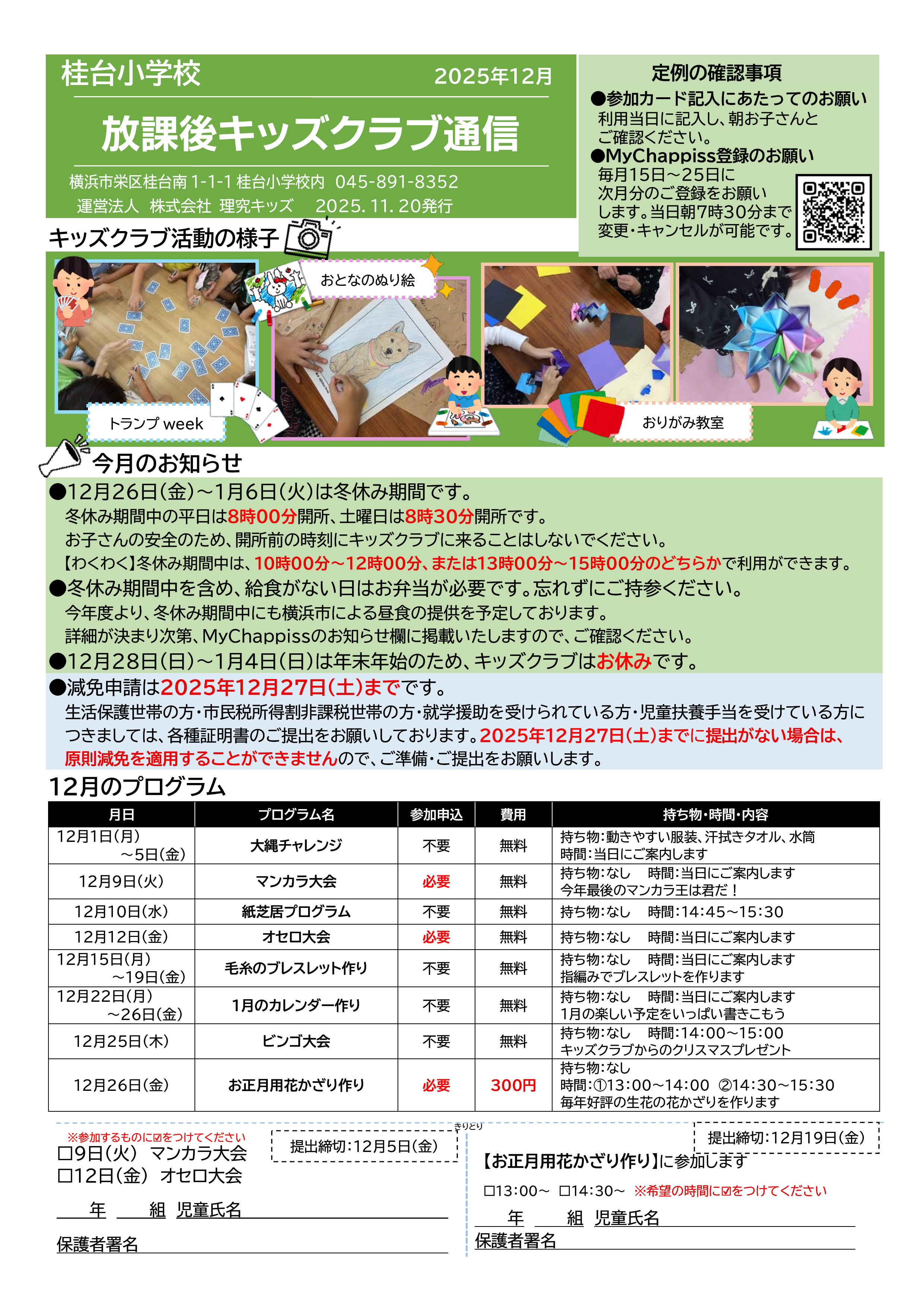警報発表時等で通常と開所時間が異なる場合は、スタッフが放課後キッズクラブに到着してから利用可能になります。