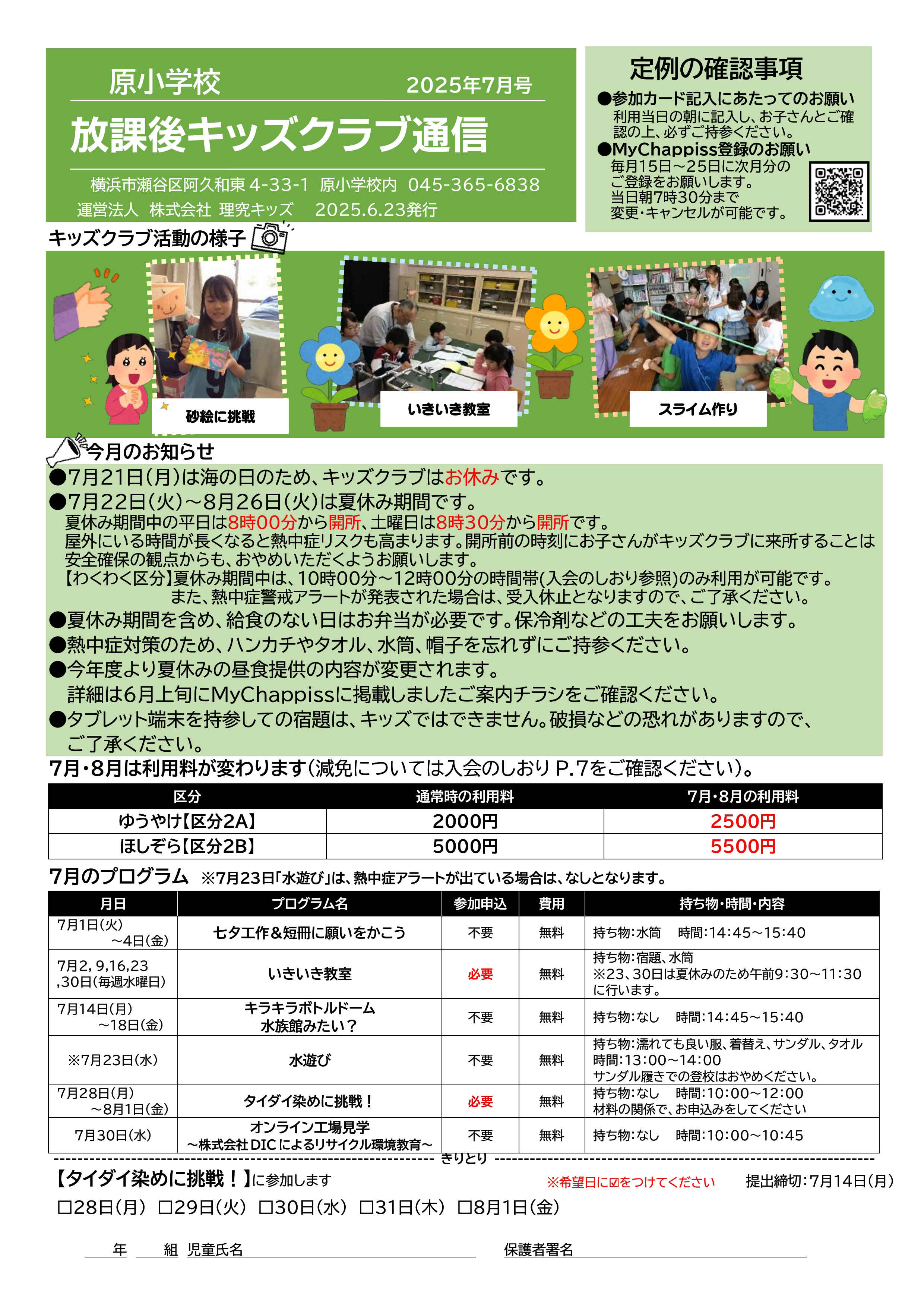- 参加カード(利用日に「帰宅時間」「お迎えの有無」「保護者印(署名も可)」の記入あり)