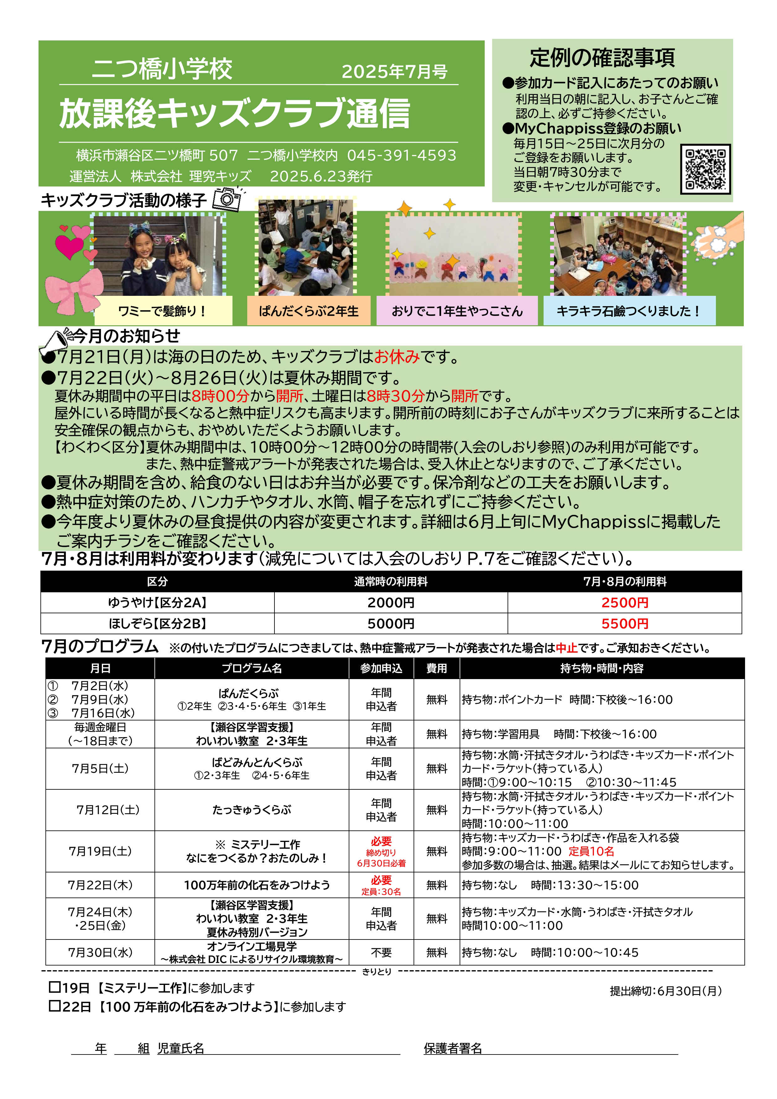 - 参加カード(利用日に「帰宅時間」「お迎えの有無」「保護者印(署名も可)」の記入あり)