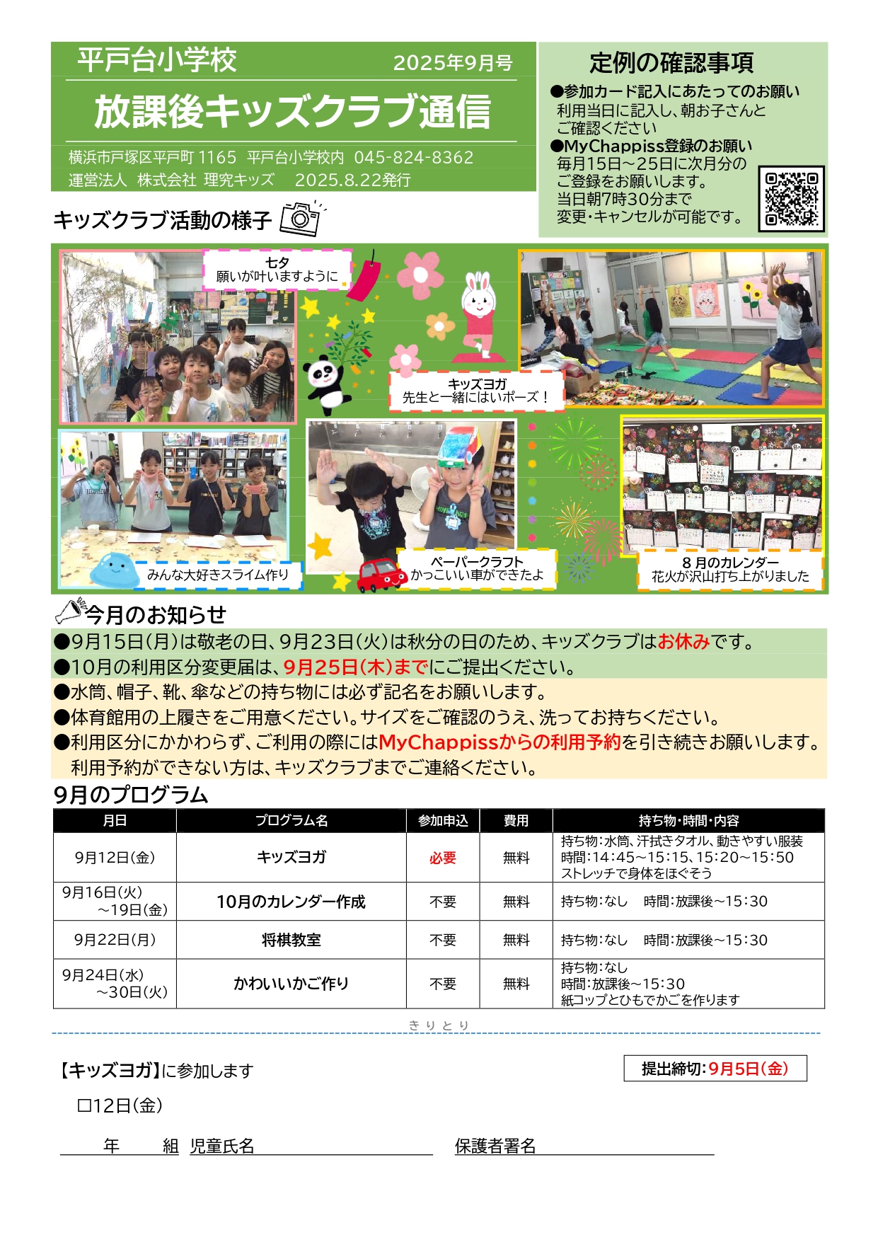 - 参加カード(利用日に「帰宅時間」「お迎えの有無」「保護者印(署名も可)」の記入あり)