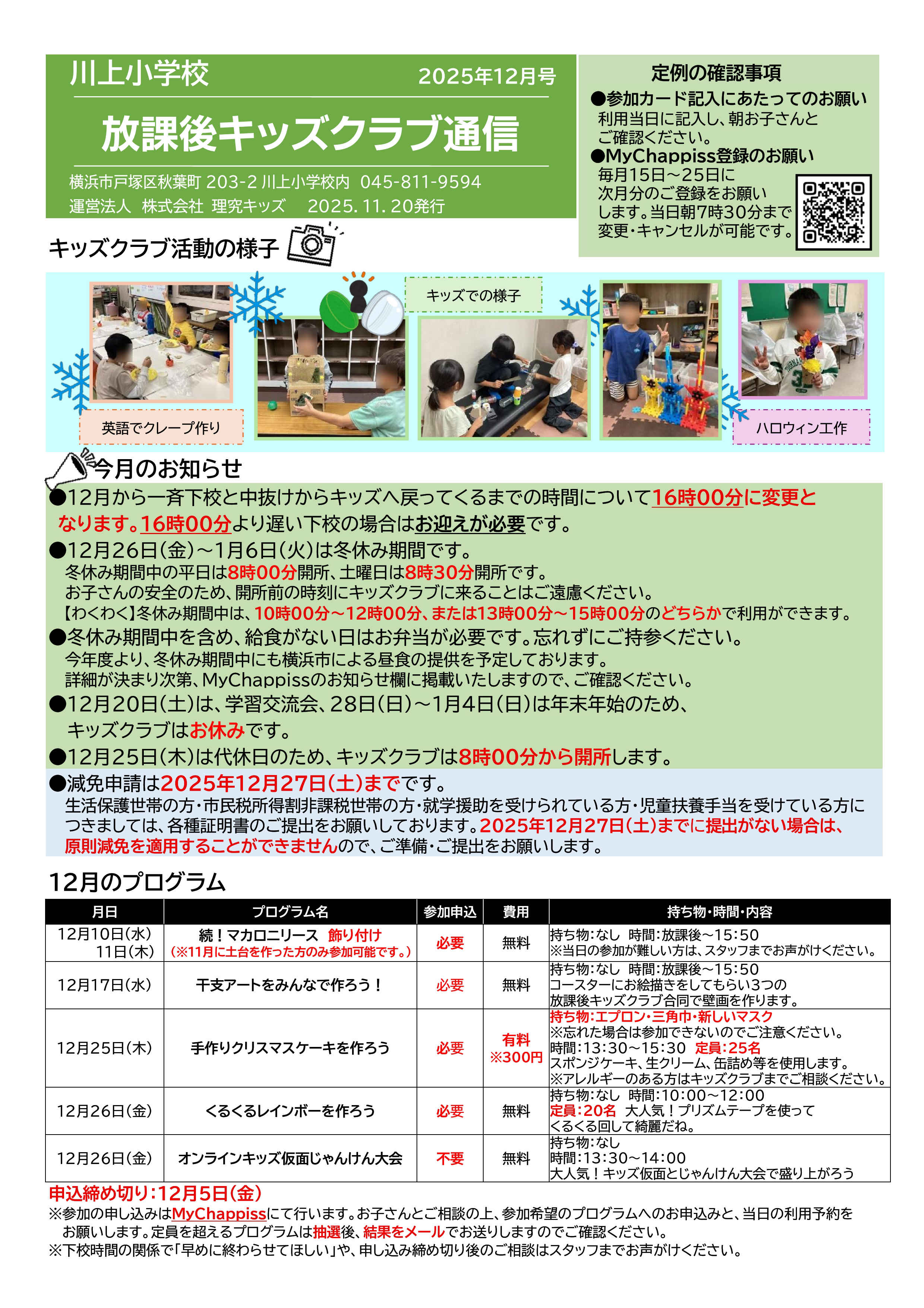 警報発表時等で通常と開所時間が異なる場合は、スタッフが放課後キッズクラブに到着してから利用可能になります。受け入れ可能になり次第、メールにてお知らせします。