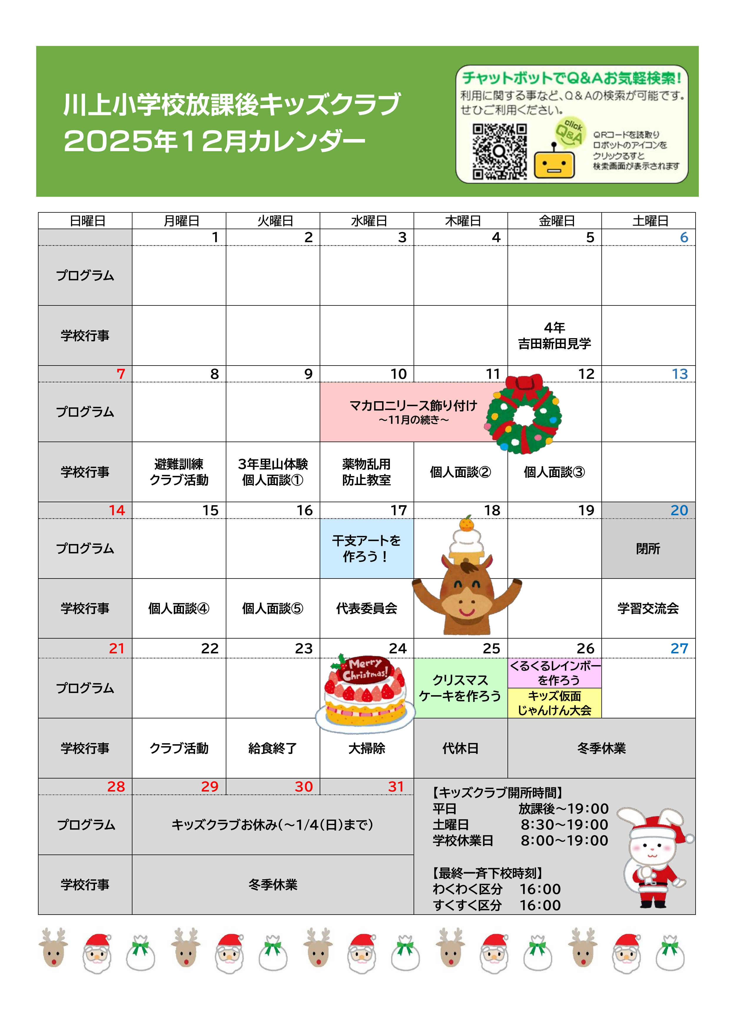 「暴風警報」・「大雪警報」・「暴風雪警報」・「降灰予報」発表中は、帰宅時刻に関わらず、利用しているすべてのお子さんの保護者か代理の方のお迎えが必要です。子どもたちはお迎えが来るまで放課後キッズクラブで待機します。