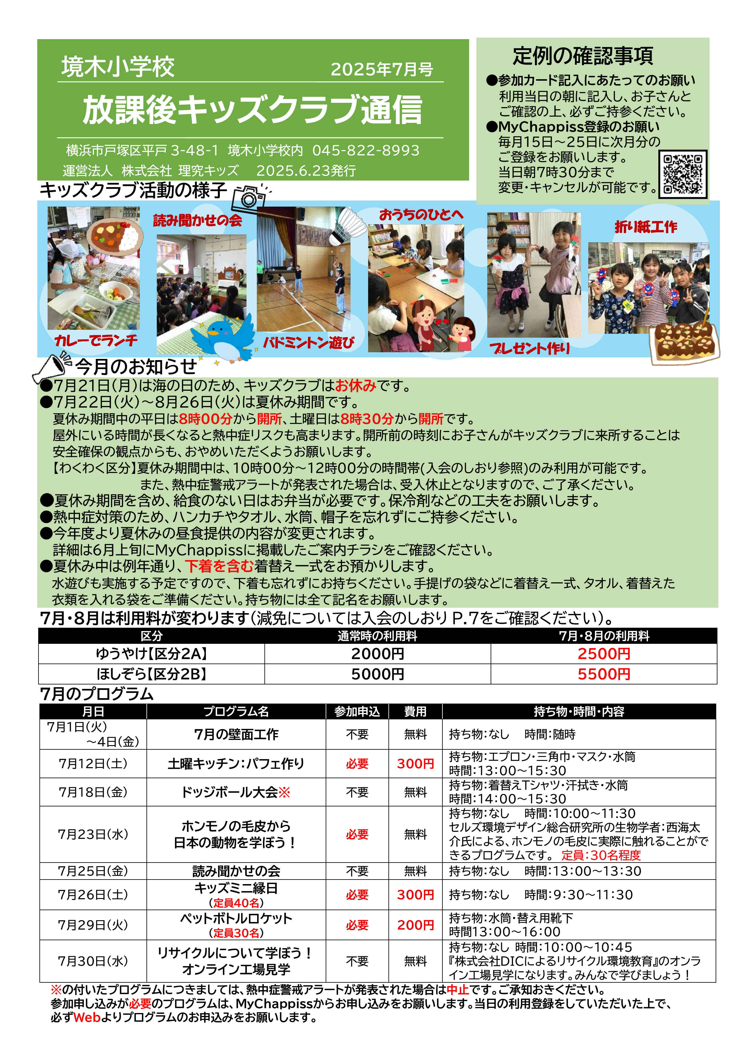※交通機関が不通となる場合もありますので、できるだけ早いお迎えをお願いします。※特別警報発表時は帰宅の安全が確保されるまで、お子さんは利用区分にかかわらず、放課後キッズクラブで留め置きとなります。