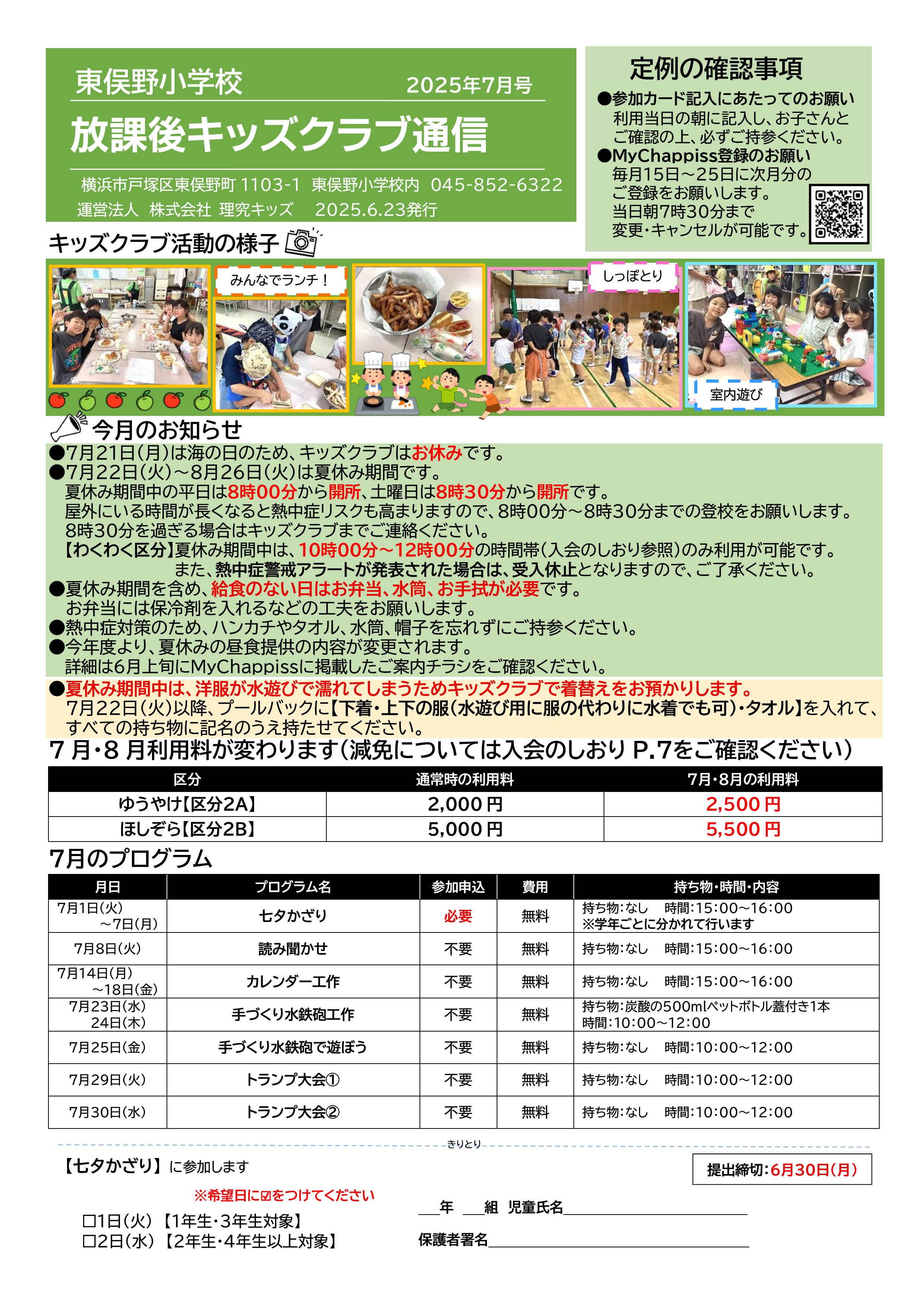 - 利用カード(参加日に「帰宅時間」「お迎えの有無」「保護者印(署名も可)」の記入あり)