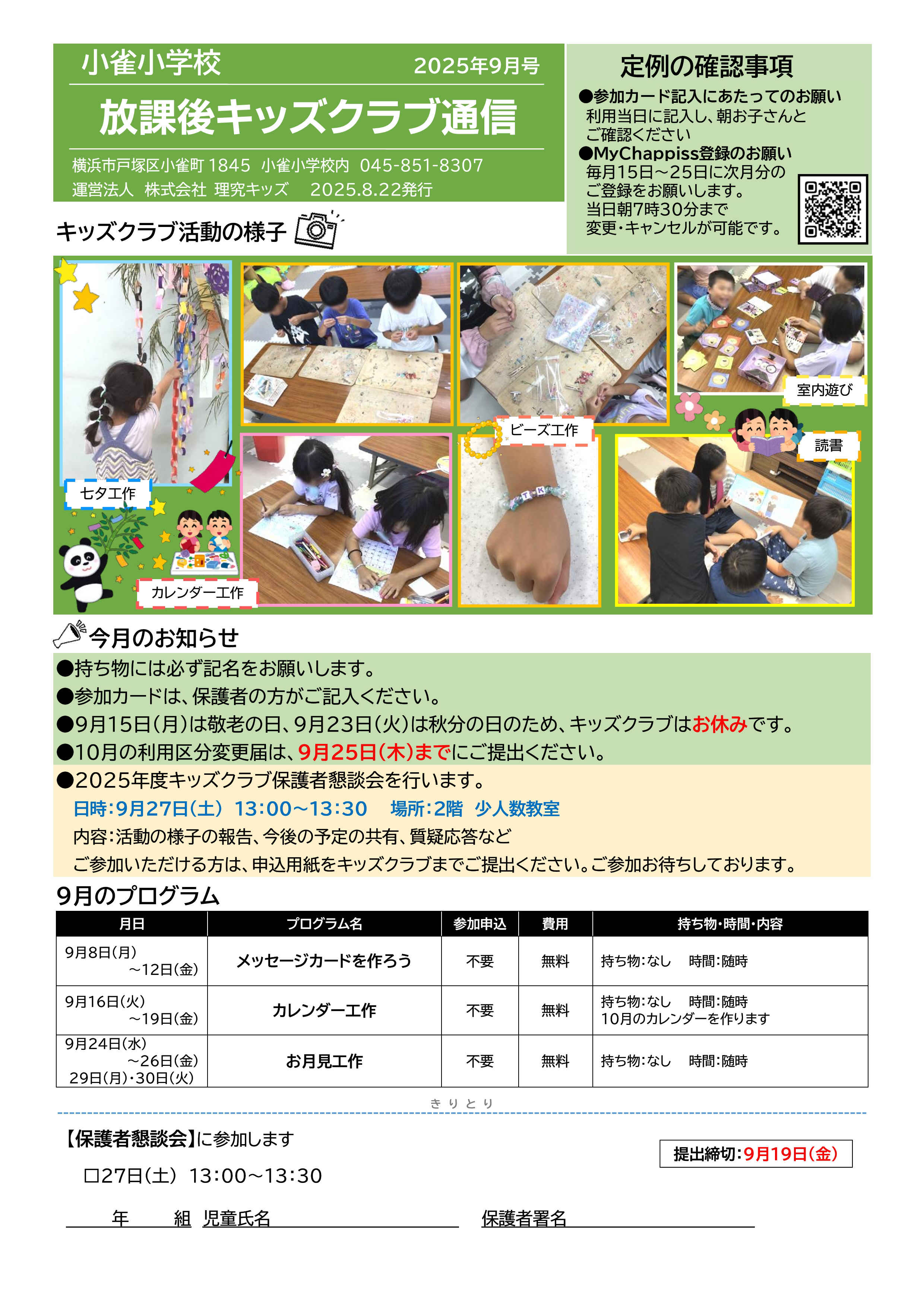 - 参加カード(利用日に「帰宅時間」「お迎えの有無」「保護者印(署名も可)」の記入あり)