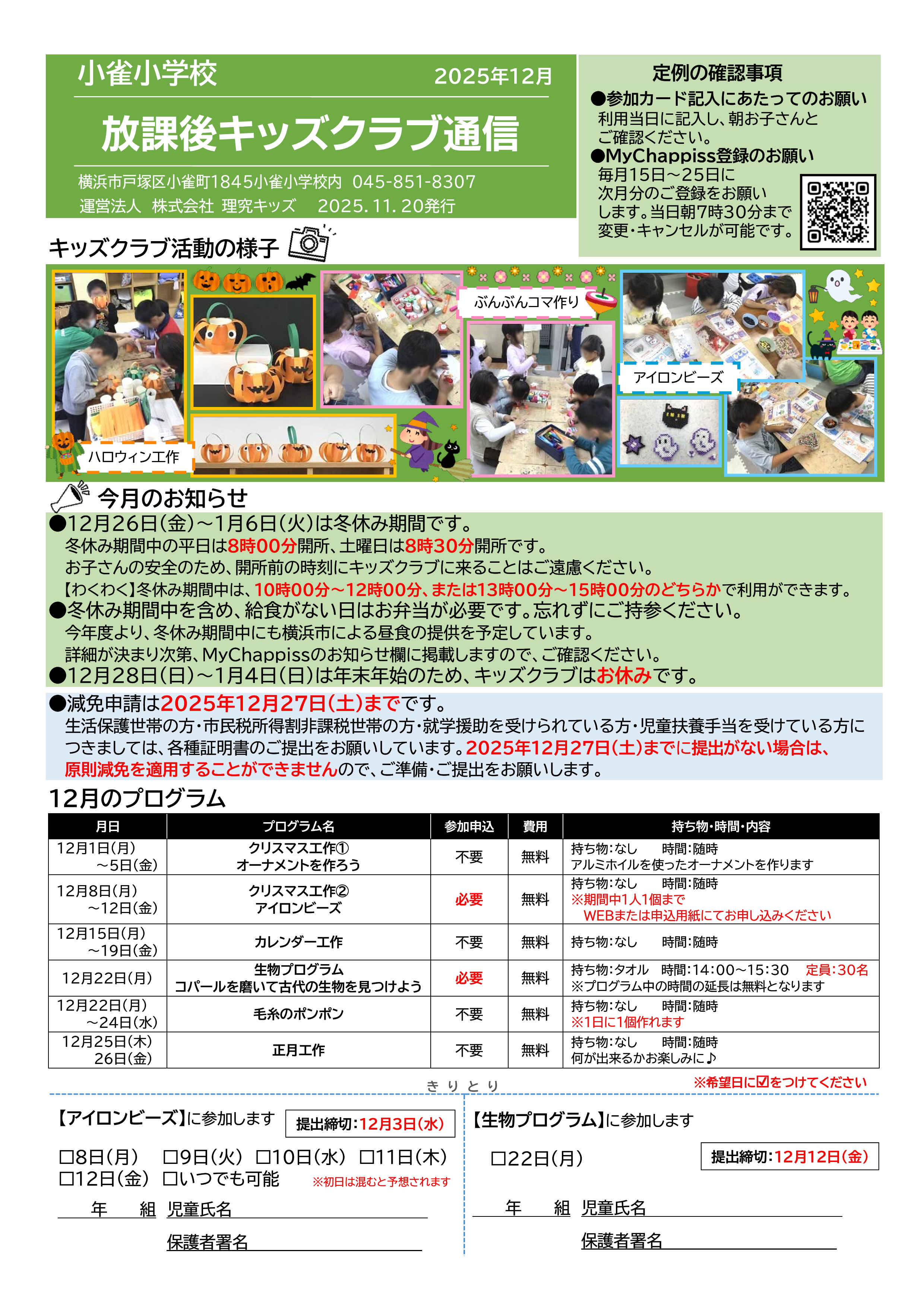 • 参加カード(利用日に「帰宅時間」「お迎えの有無」「保護者印(署名も可)」の記入あり)