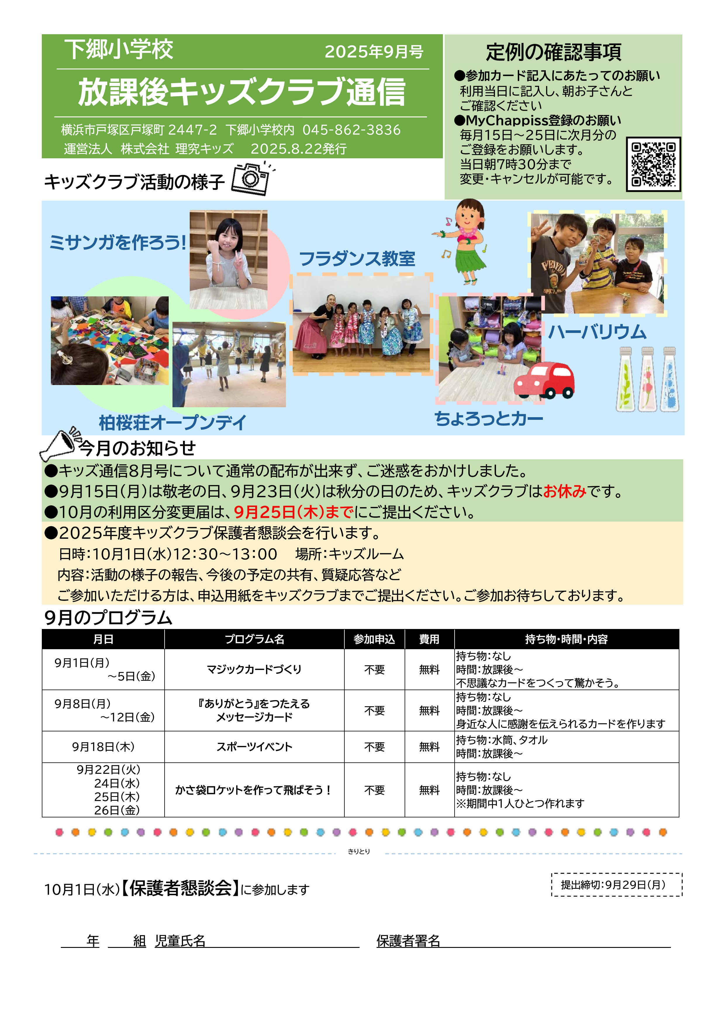 - 参加カード(利用日に「帰宅時間」「お迎えの有無」「保護者印(署名も可)」の記入あり)