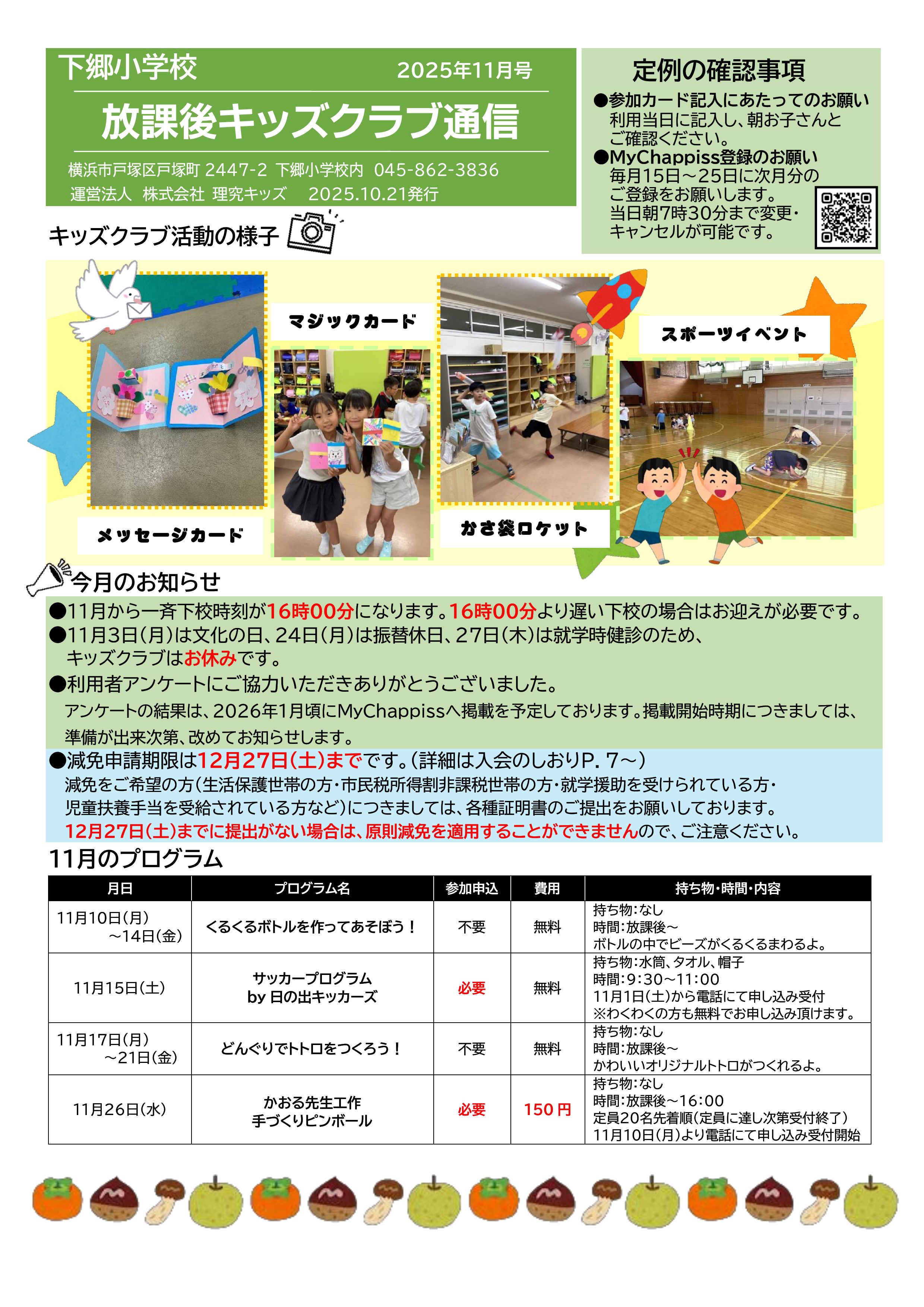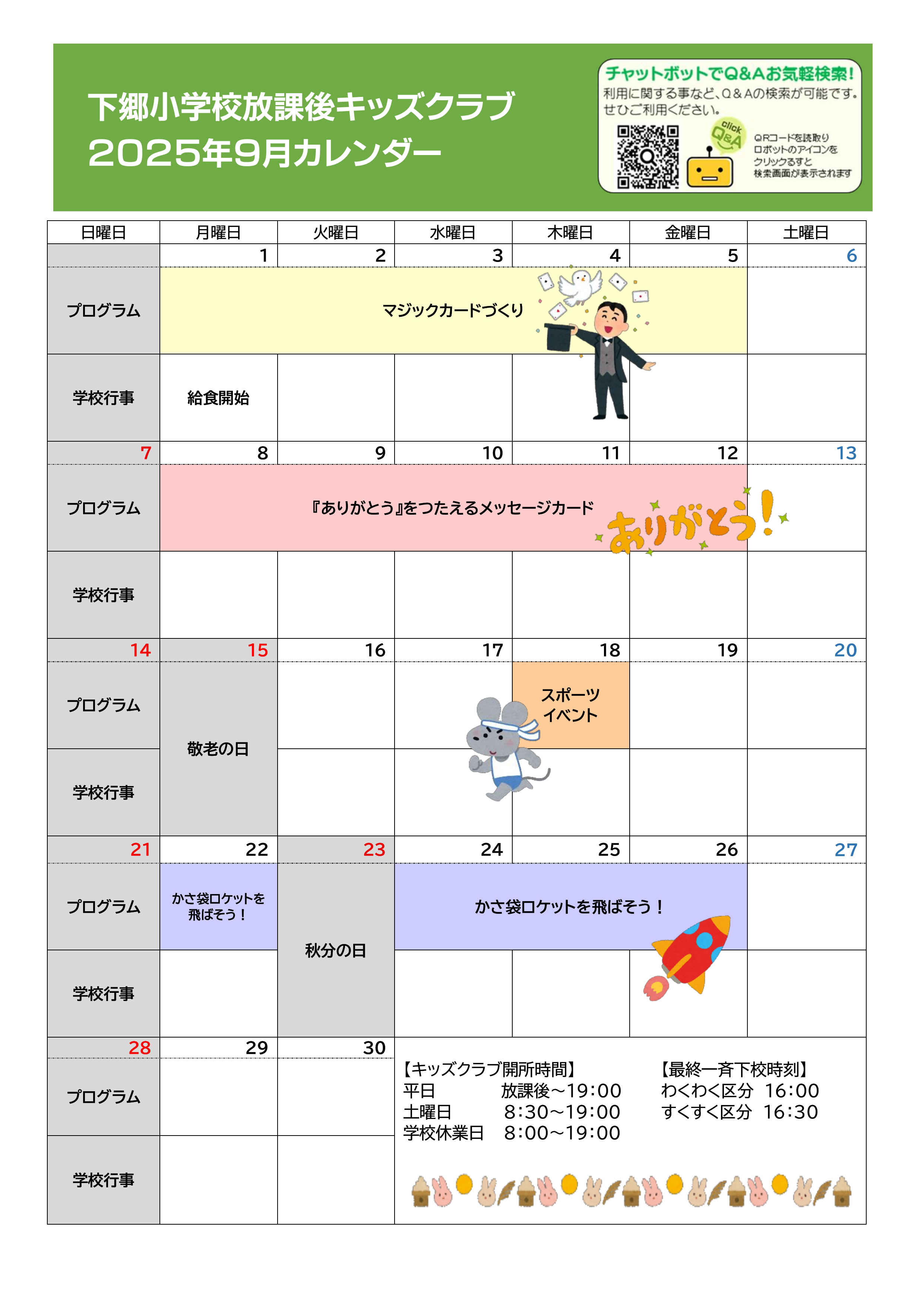 警報発表時等で通常と開所時間が異なる場合は、スタッフが放課後キッズクラブに到着してから利用可能になります。受け入れ可能になり次第、メールにてお知らせします。