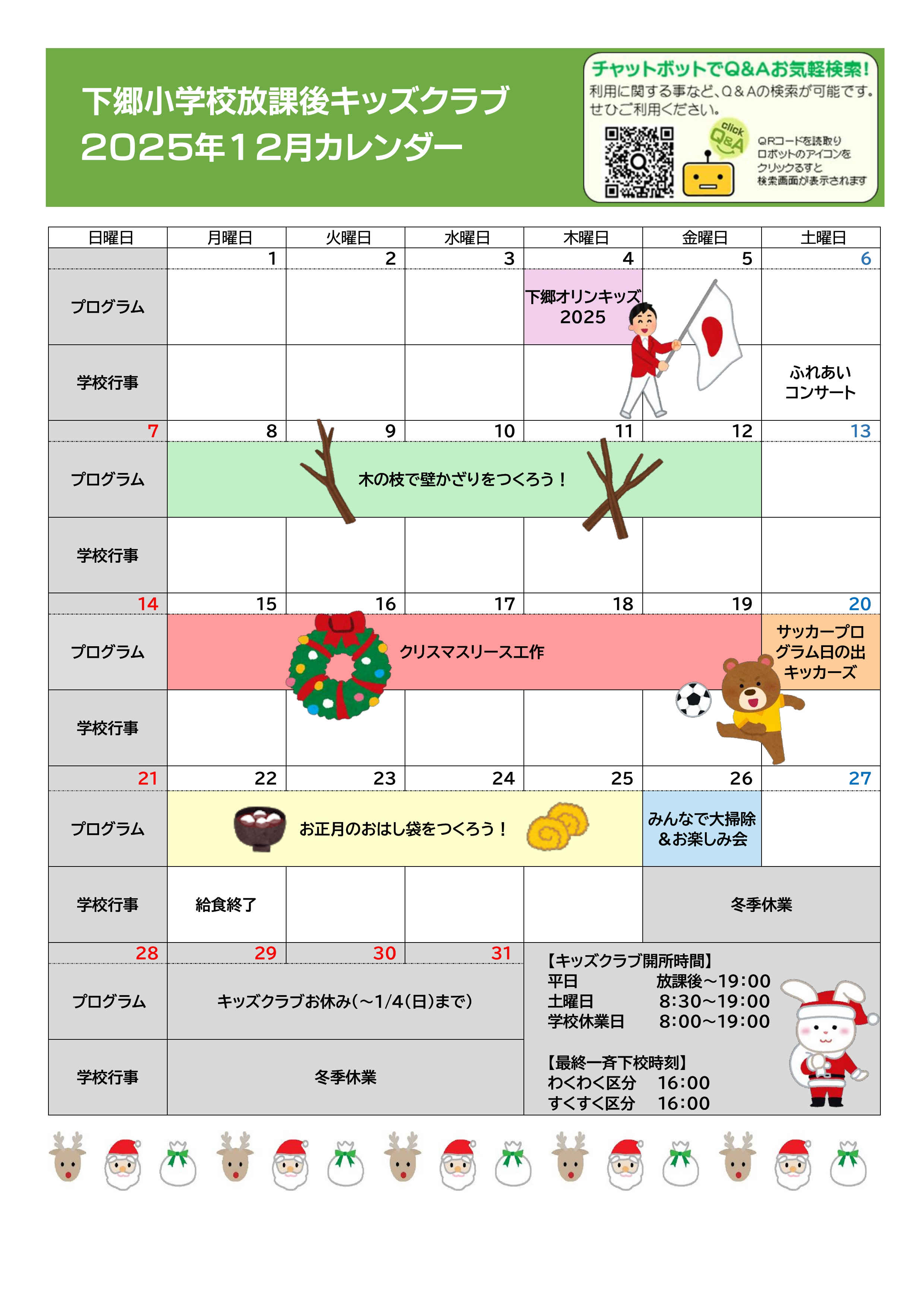 「暴風警報」・「大雪警報」・「暴風雪警報」・「降灰予報」発表中は、帰宅時刻に関わらず、利用しているすべてのお子さんの保護者か代理の方のお迎えが必要です。子どもたちはお迎えが来るまで放課後キッズクラブで待機します。