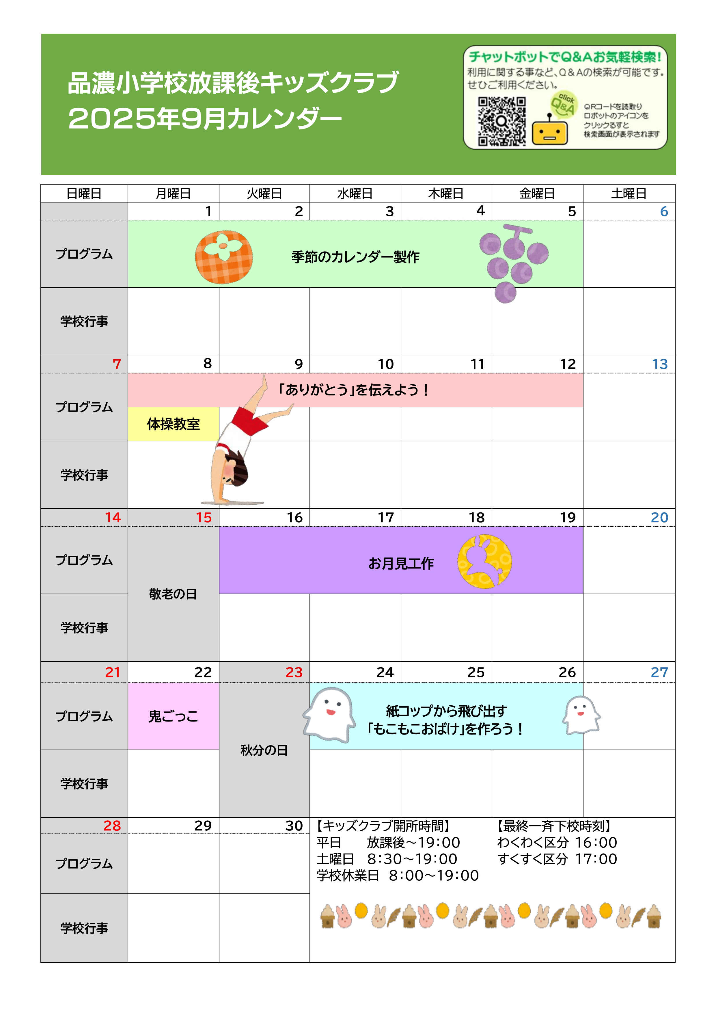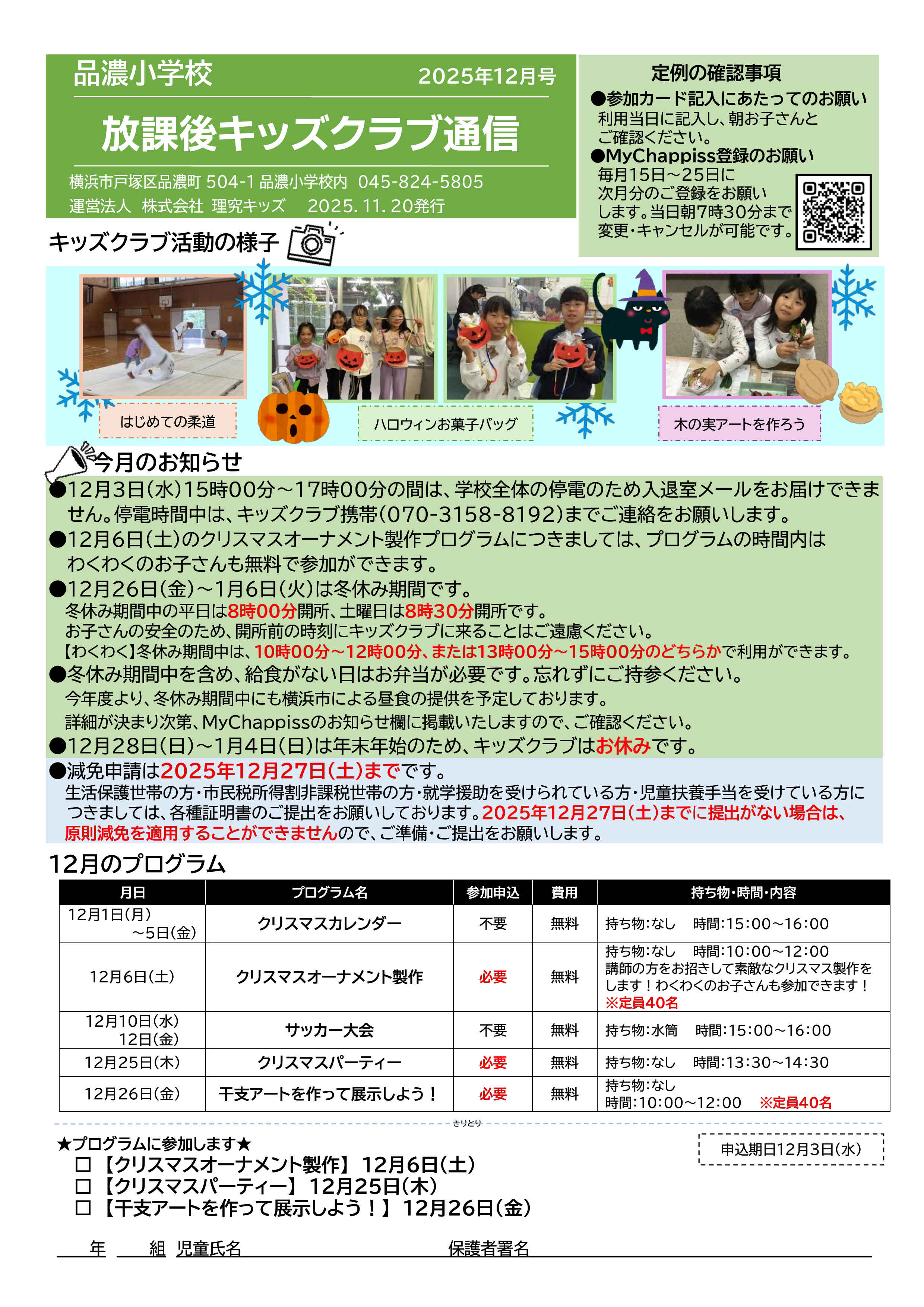 ※交通機関が不通となる場合もありますので、できるだけ早いお迎えをお願いします。※特別警報発表時は帰宅の安全が確保されるまで、お子さんは利用区分にかかわらず、放課後キッズクラブで留め置きとなります。