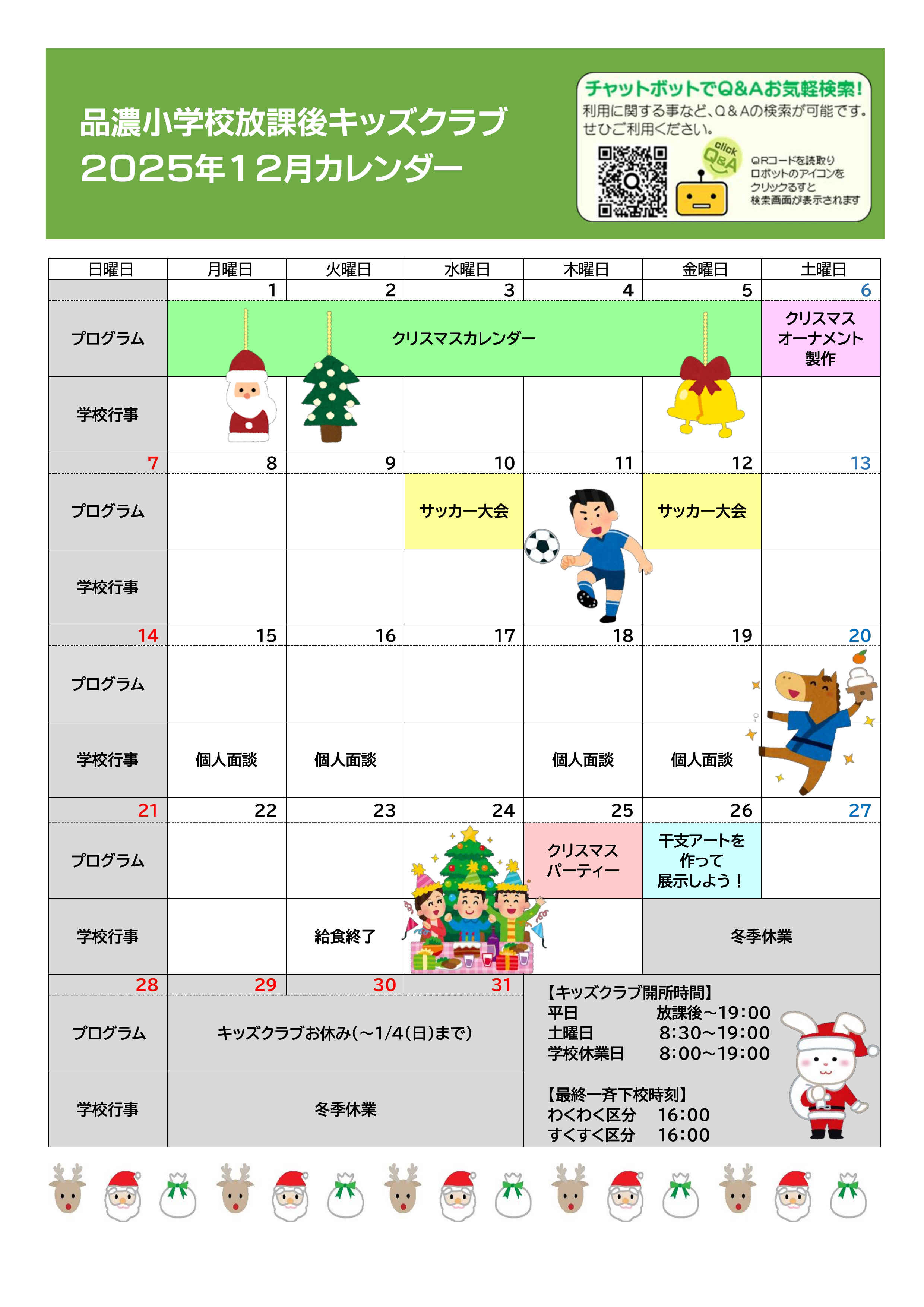 「暴風警報」・「大雪警報」・「暴風雪警報」・「降灰予報」発表中は、帰宅時刻に関わらず、利用しているすべてのお子さんの保護者か代理の方のお迎えが必要です。子どもたちはお迎えが来るまで放課後キッズクラブで待機します。