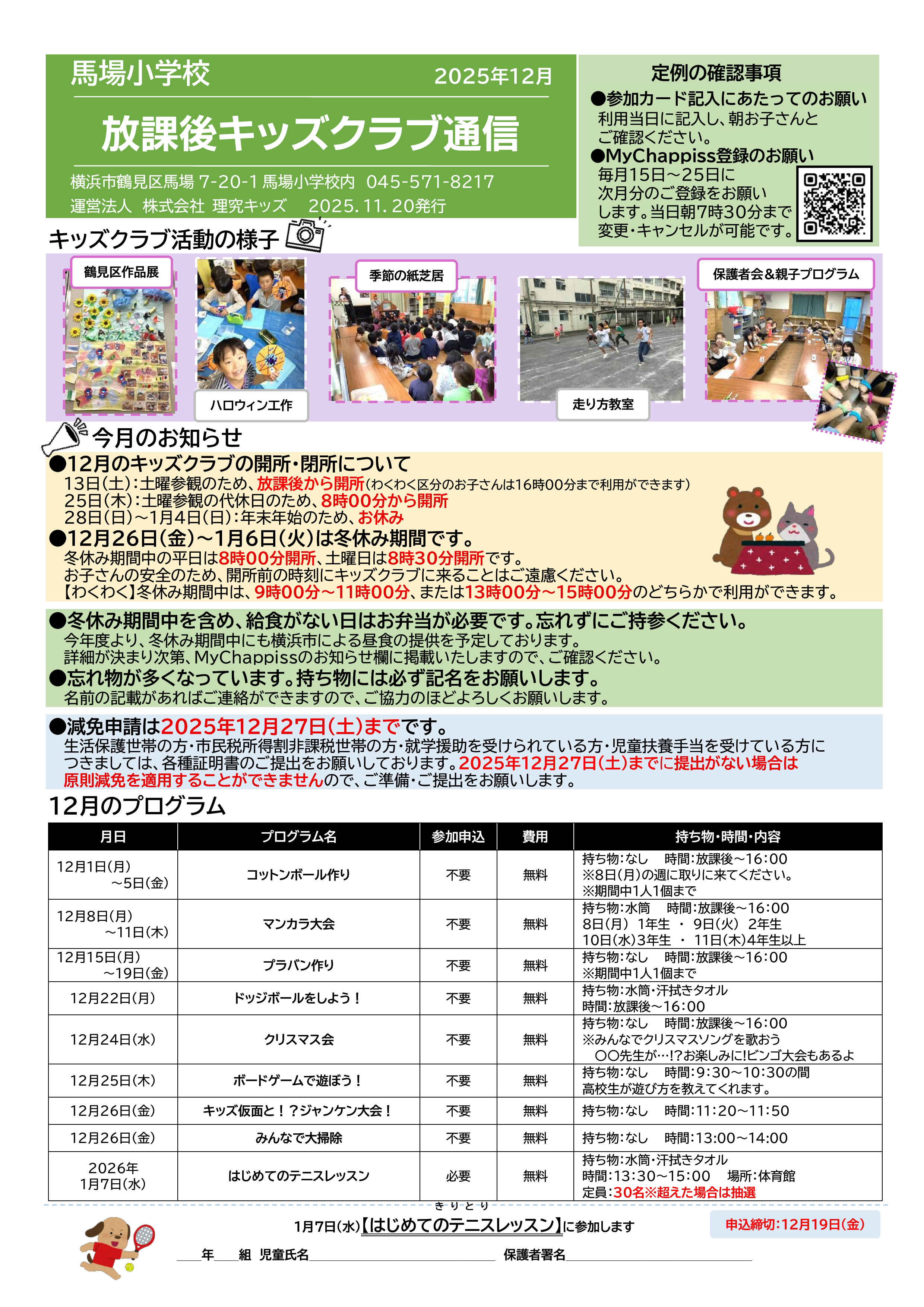 ※交通機関が不通となる場合もありますので、できるだけ早いお迎えをお願いします。※特別警報発表時は帰宅の安全が確保されるまで、お子さんは利用区分にかかわらず、放課後キッズクラブで留め置きとなります。