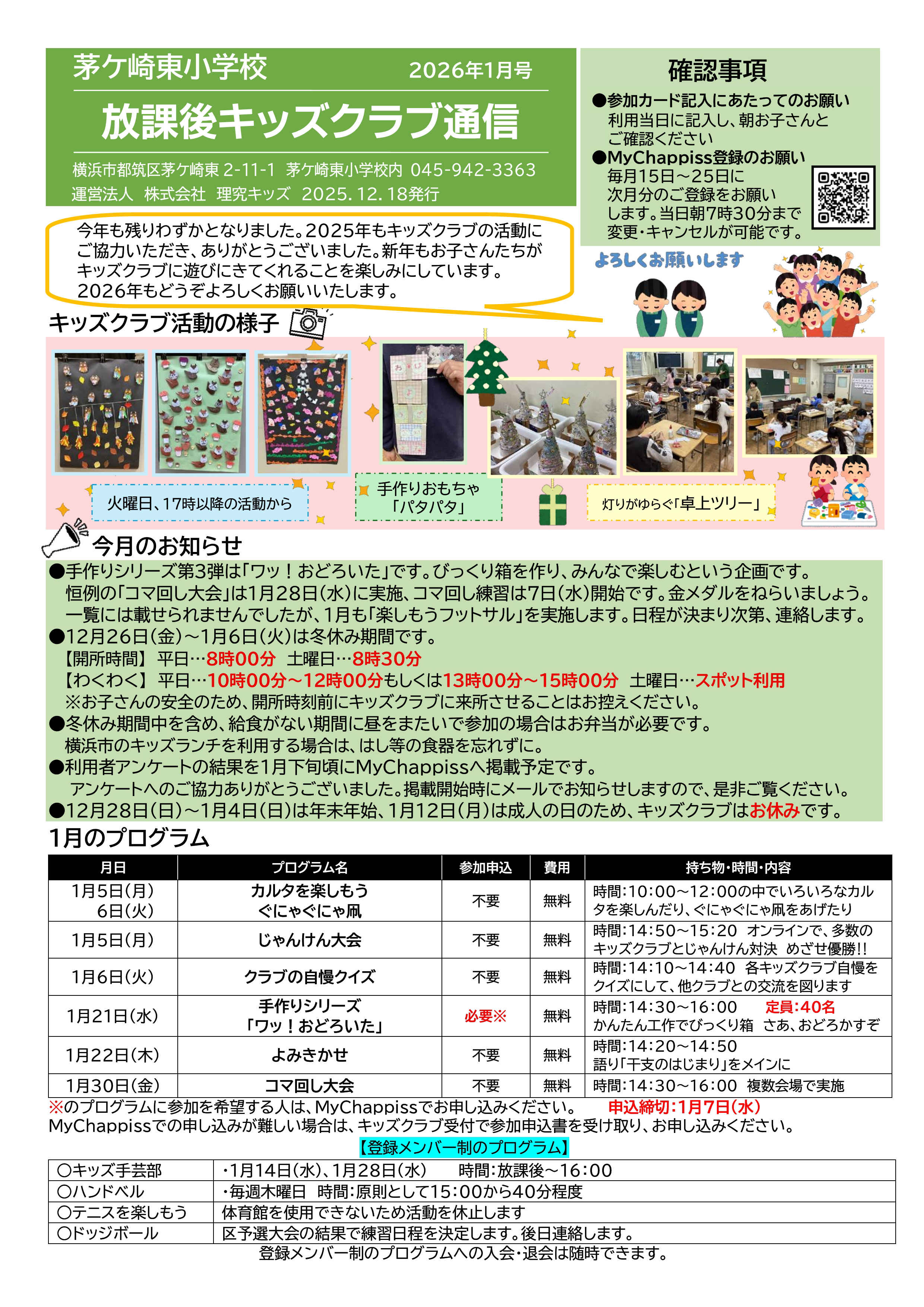 午前6時の段階で横浜市内に「暴風警報」「大雪警報」「暴風雪警報」「降灰予報」が発表された場合、放課後キッズクラブは開所せず、閉所とします。