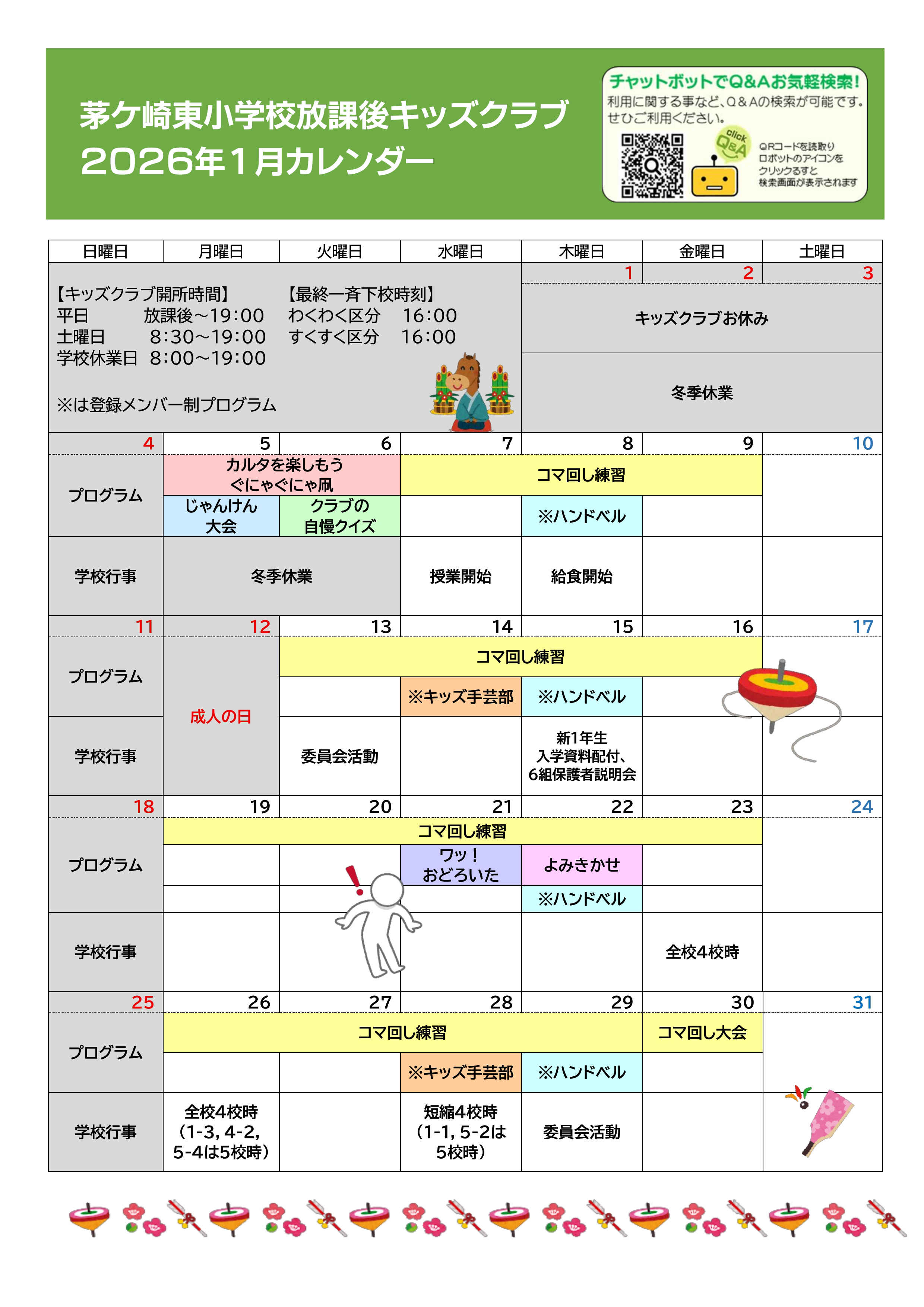 「暴風警報」・「大雪警報」・「暴風雪警報」・「降灰予報」発表中は、帰宅時刻に関わらず、利用しているすべてのお子さんの保護者か代理の方のお迎えが必要です。子どもたちはお迎えが来るまで放課後キッズクラブで待機します。