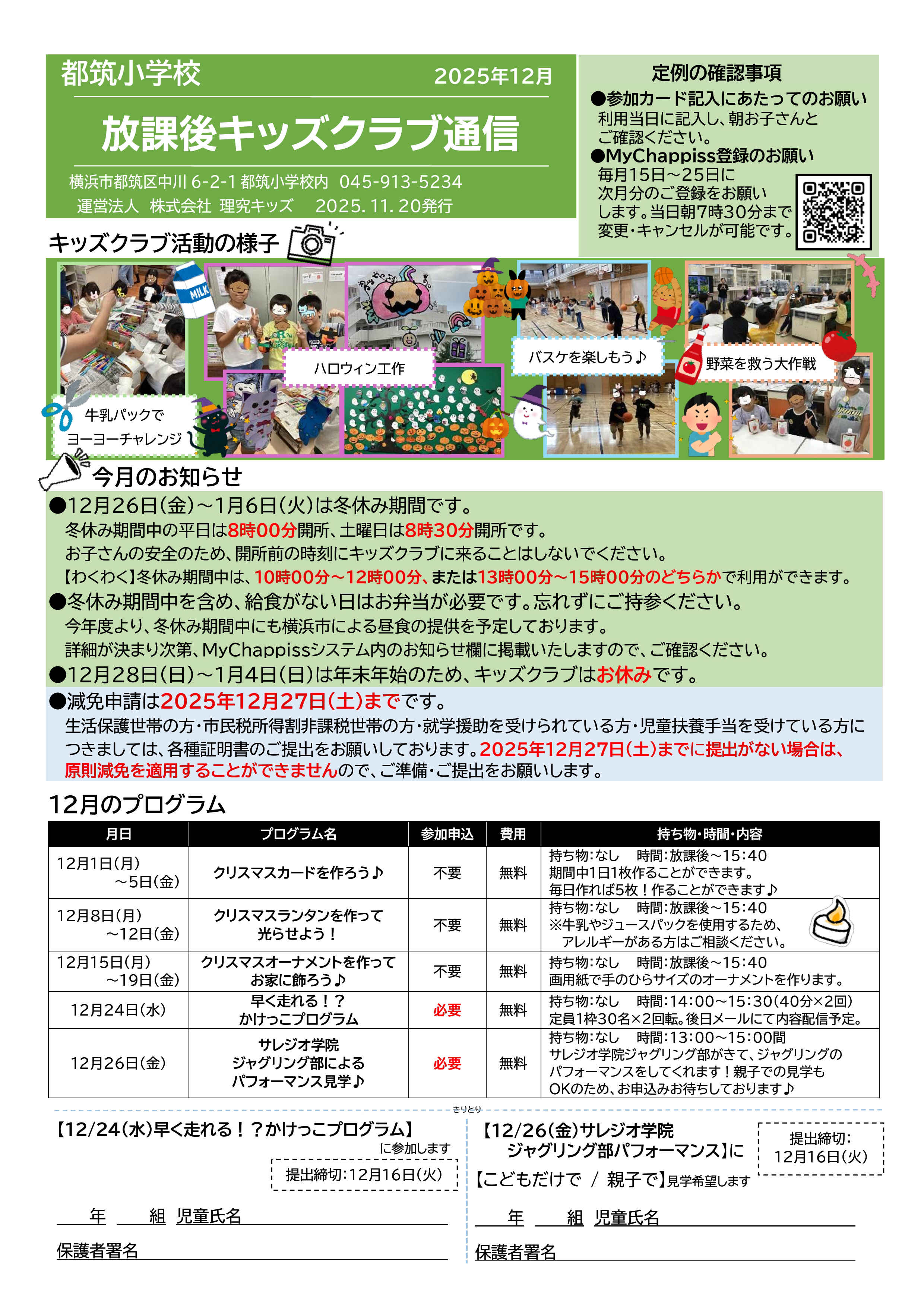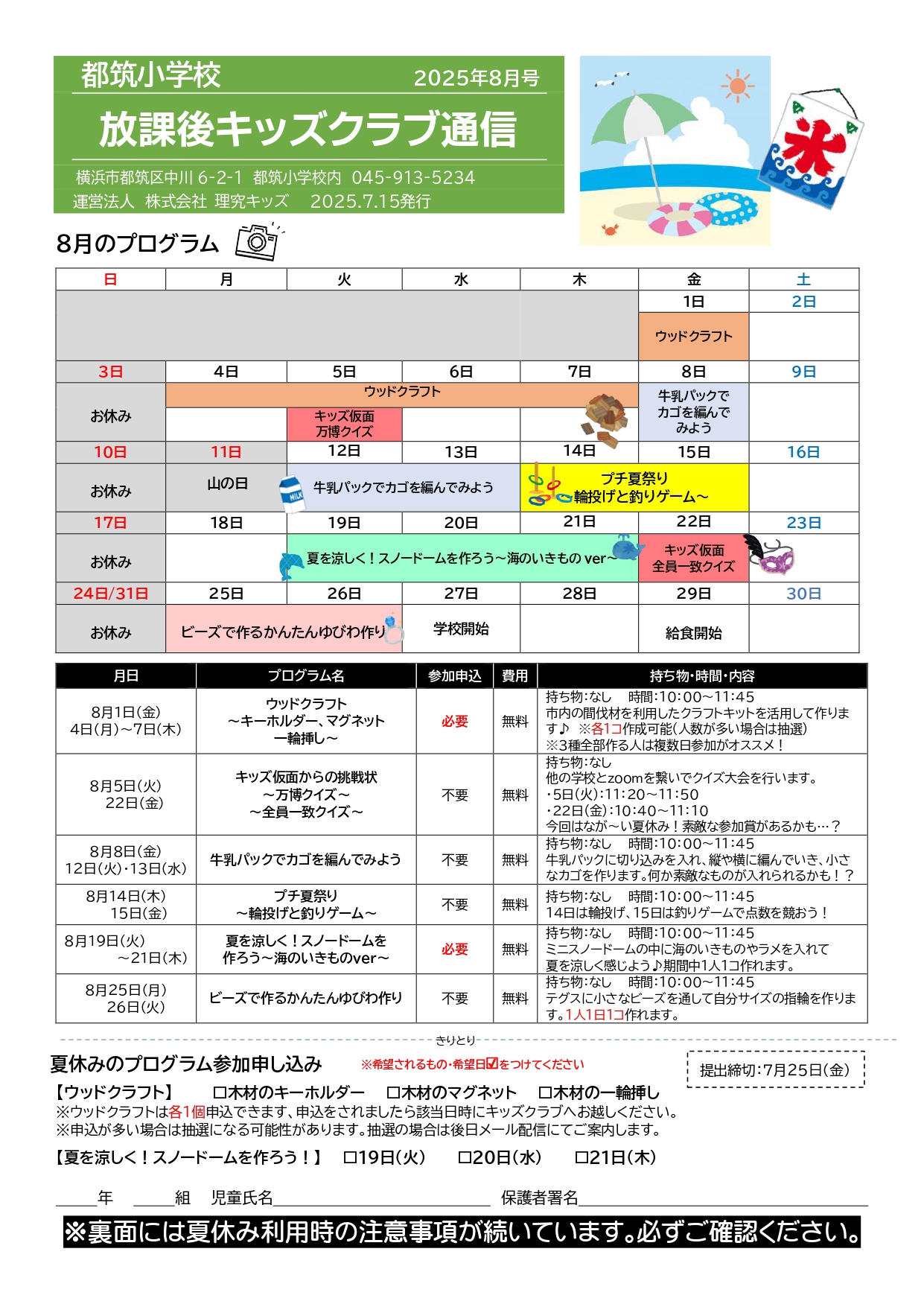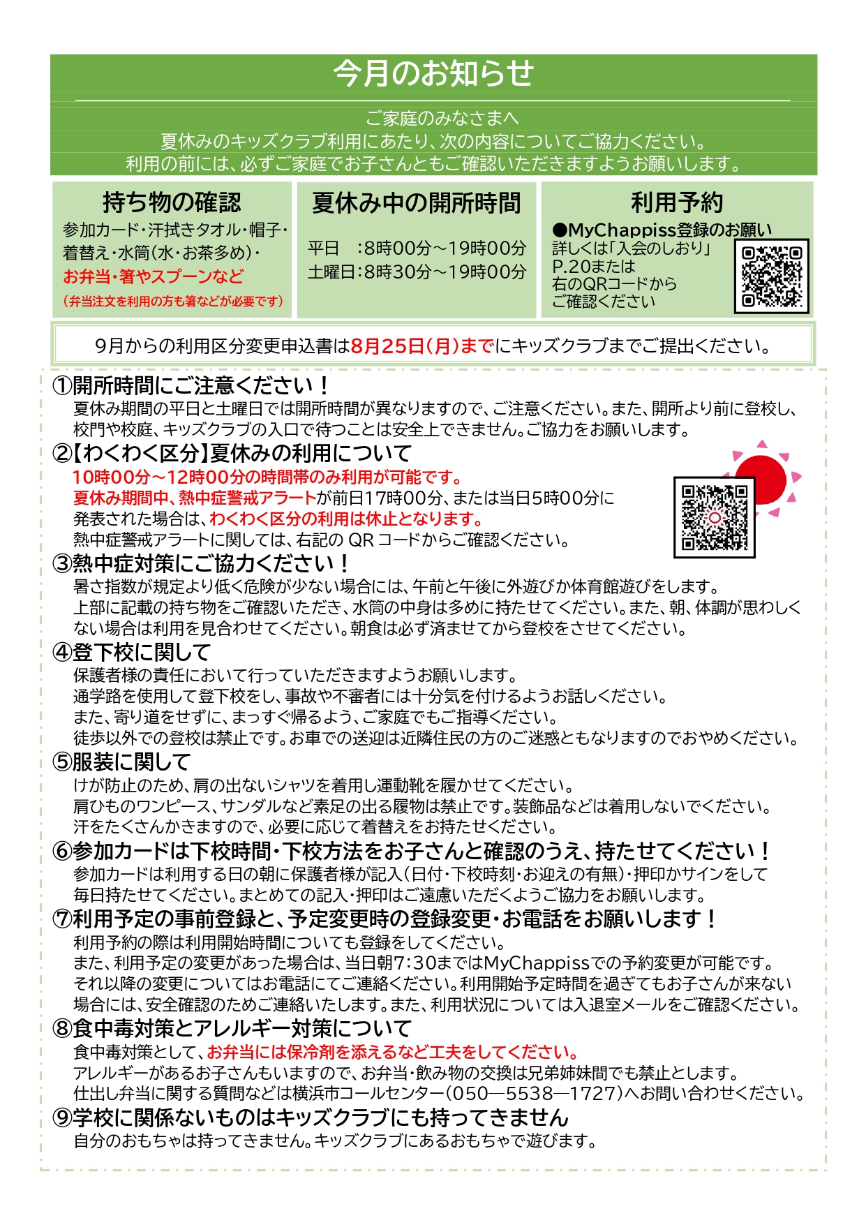 ※交通機関が不通となる場合もありますので、できるだけ早いお迎えをお願いします。※特別警報発表時は帰宅の安全が確保されるまで、お子さんは利用区分にかかわらず、放課後キッズクラブで留め置きとなります。